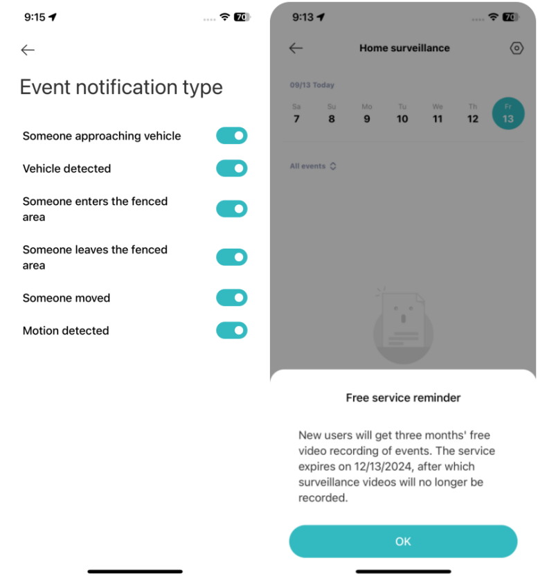 2. คุณยังสามารถเปิดใช้งาน [Vehicle detected] และ [Someone a pproaching v ehicle] ใน [การตั้งค่า]> > [Home surveillance settings] >> เปิด[ การเฝ้าระวังภายในบ้าน] >>เปิดใช้งาน [Detection push notifications] >> [การแจ้งเตือนเหตุการณ์ t ype] เพื่อรับการแจ้งเตือนเกี่ยวกับการตรวจจับยานพาหนะขณะบันทึกวิดีโอ
