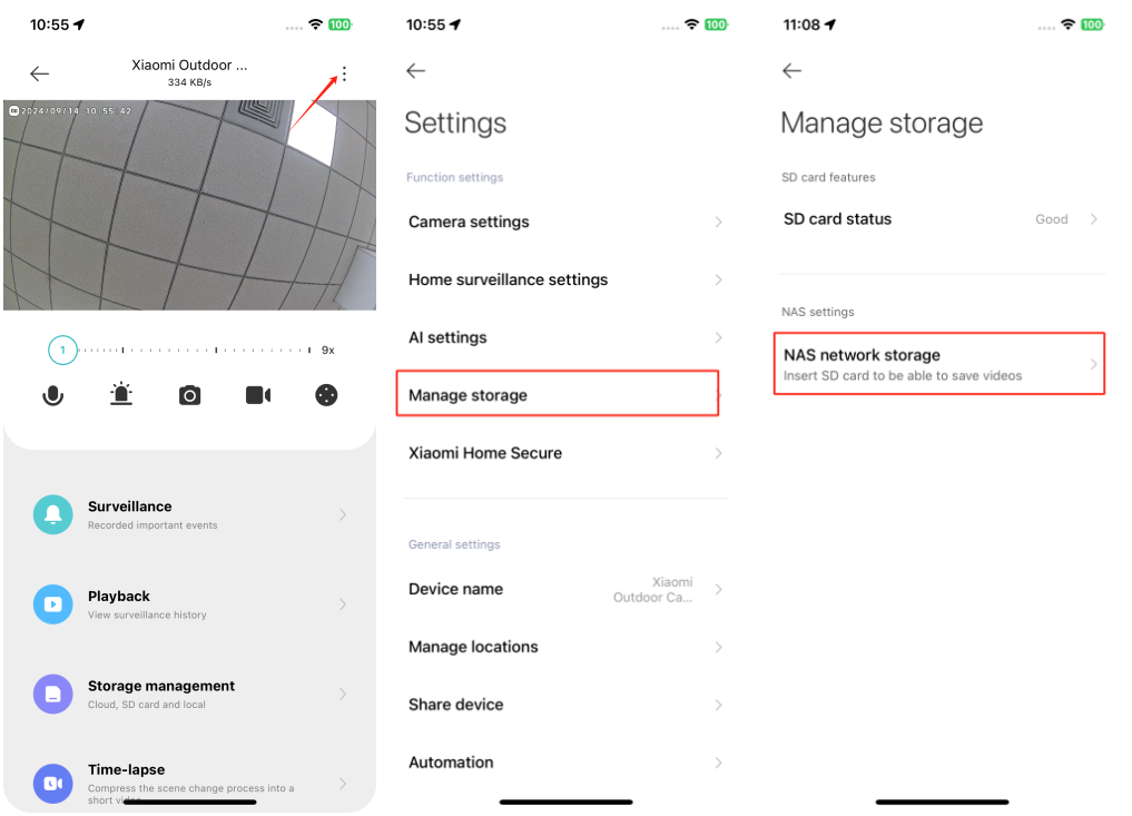 เข้าถึงแอป Mi Home/Xiaomi Home>>เลือก>กล้อง> แตะไอคอนสามจุดที่>ขวาบน> [จัดการที่เก็บข้อมูล]> > ตรวจสอบว่าสวิตช์จัดเก็บข้อมูลปิดอยู่หรือตั้งค่าให้บันทึกเฉพาะเมื่อตรวจพบการเคลื่อนไหว