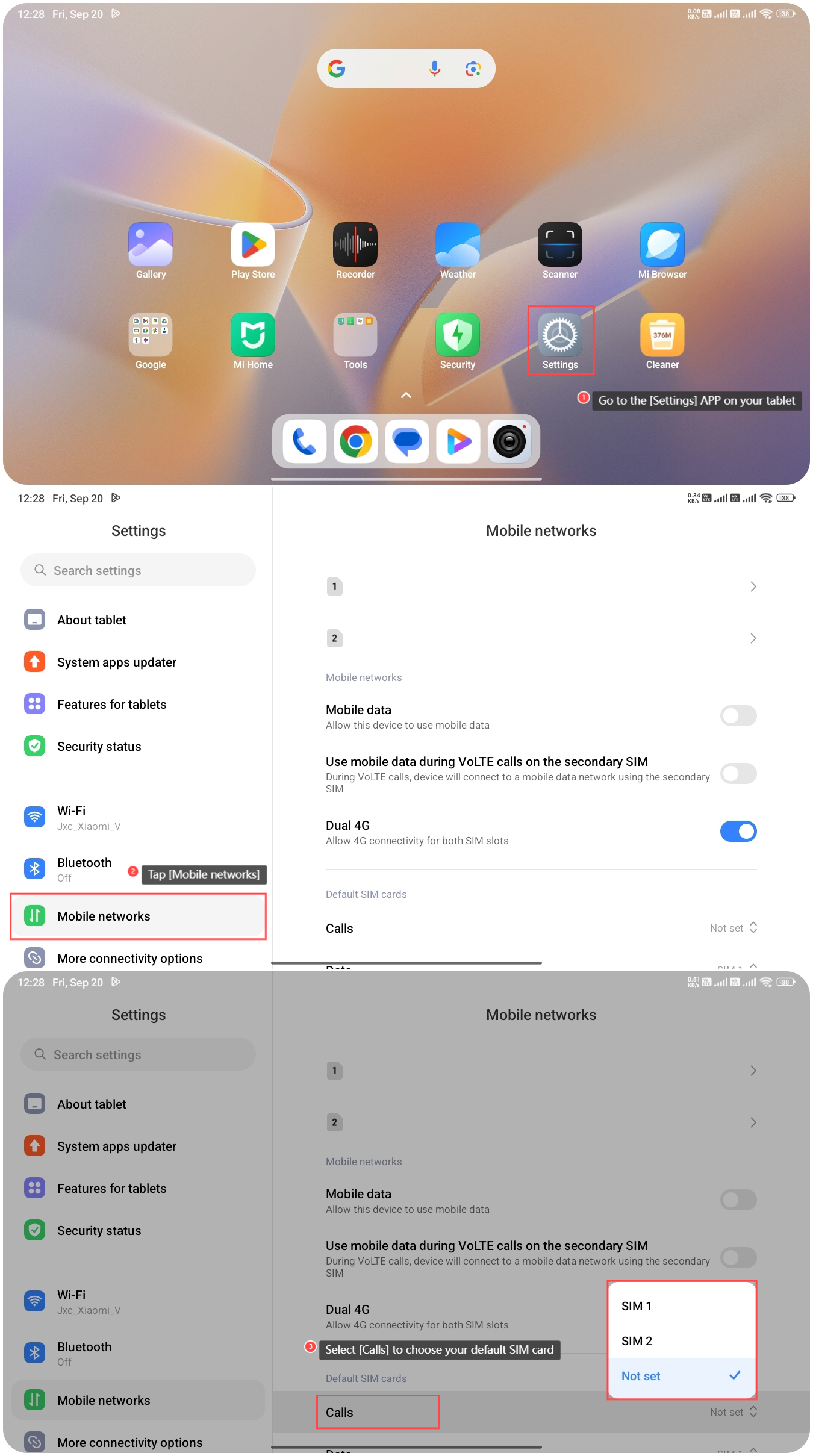 ในการตั้งค่าซิมการ์ดเริ่มต้นสําหรับการโทรบนแท็บเล็ต โปรดดู ขั้นตอน ต่อไปนี้: