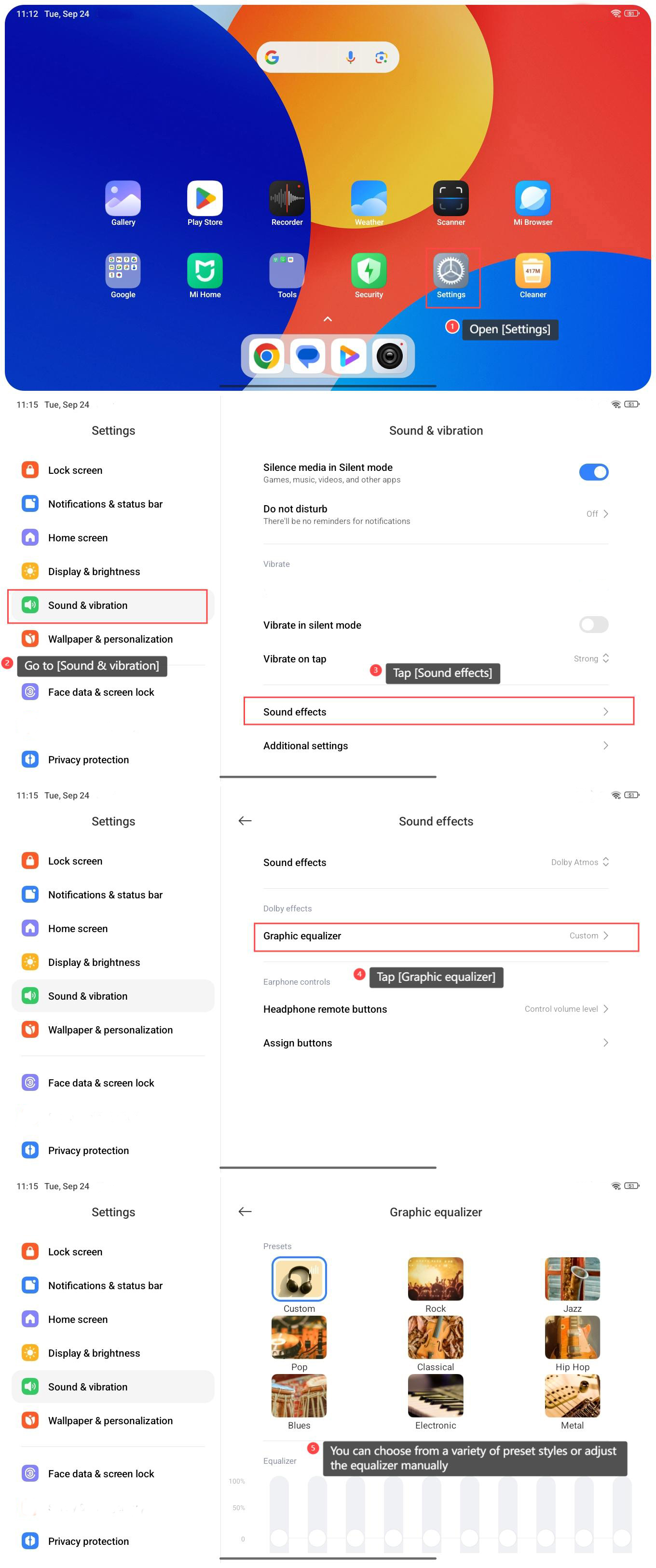 ในการตั้งค่าอีควอไลเซอร์กราฟิกบน REDMI Pad SE 8.7 โปรดดูขั้นตอนต่อไปนี้: