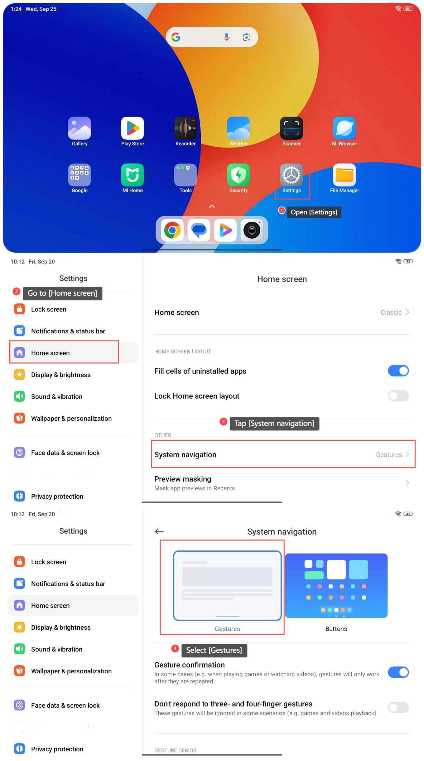 หากต้องการใช้การนําทางระบบด้วยท่าทางบน REDMI Pad SE 8.7 โปรดดูขั้นตอนต่อไปนี้: