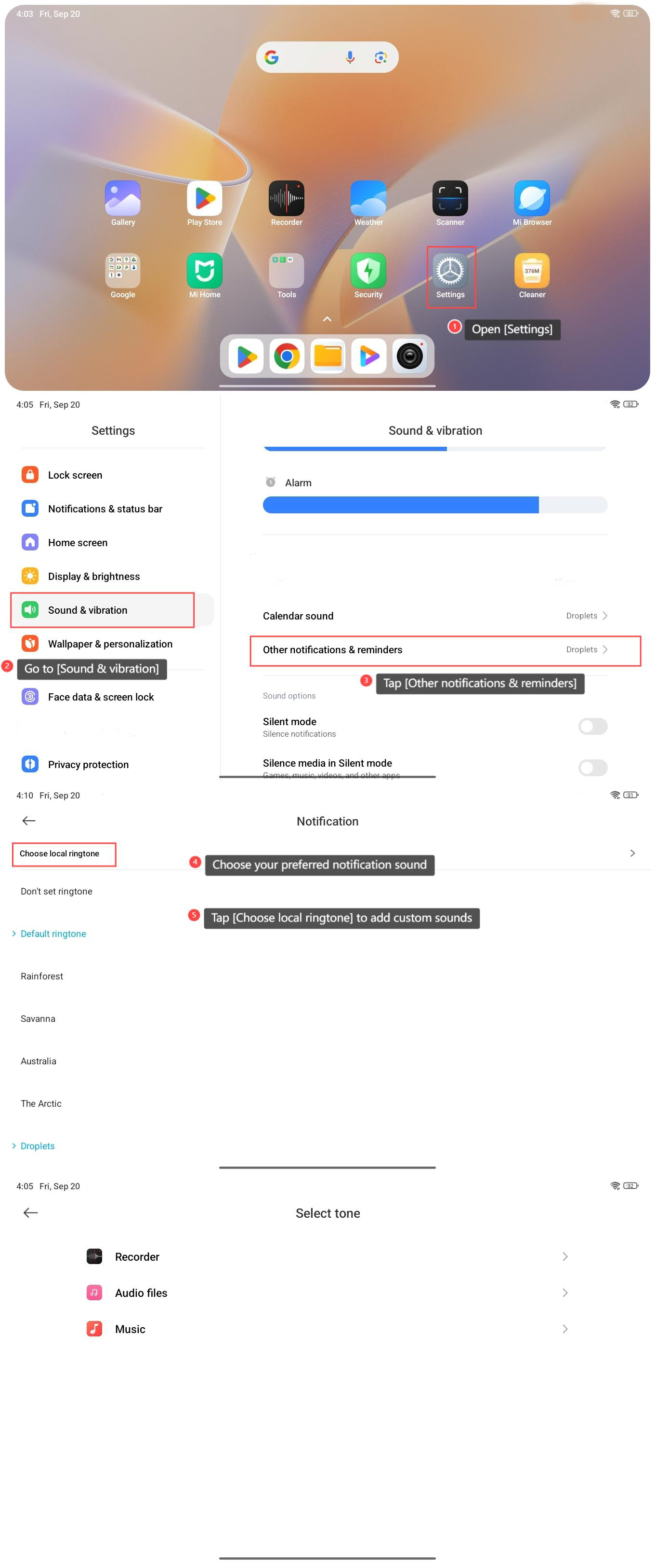 5. คุณยังสามารถแตะ [เลือกเสียงเรียกเข้าในเครื่อง] เพื่อเพิ่มเสียงที่กําหนดเองจาก [Recorder], [ไฟล์ Audio] และ [เพลง]