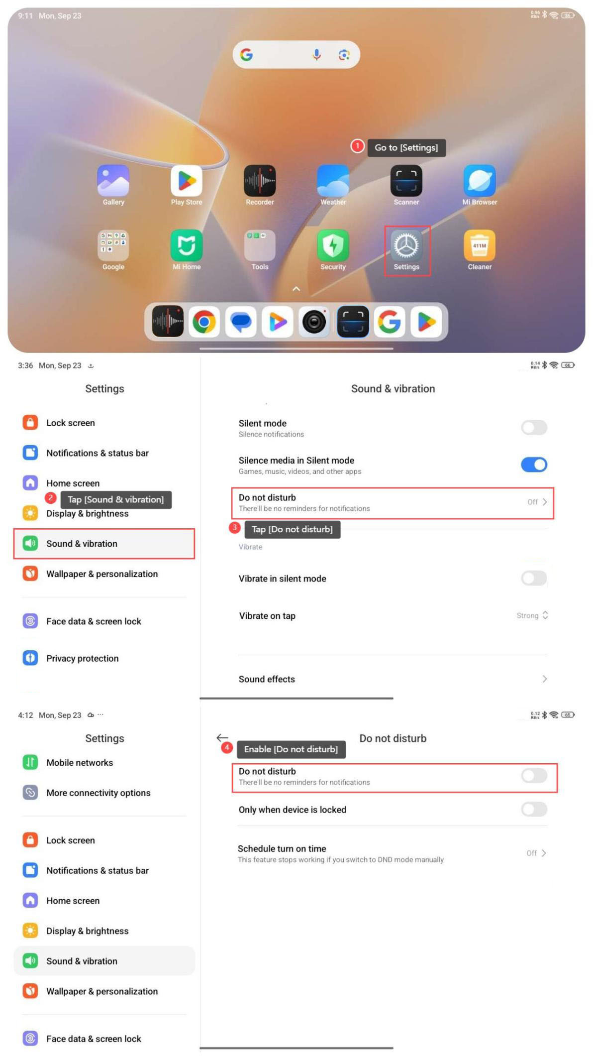REDMI Pad SE 8.7 รองรับฟังก์ชันห้ามรบกวน ซึ่งสามารถป้องกันไม่ให้การแจ้งเตือนรบกวนคุณระหว่างการประชุม กิจกรรม หรือเวลาส่วนตัว คุณสามารถมีสมาธิกับงานหรือกิจกรรมได้ดีขึ้นโดยไม่มีสิ่งรบกวน นอกจากนี้ การเปิดใช้งานห้ามรบกวนในเวลากลางคืนยังช่วยให้นอนหลับได้อย่างต่อเนื่องโดยการปิดเสียงการแจ้งเตือนและการโทร