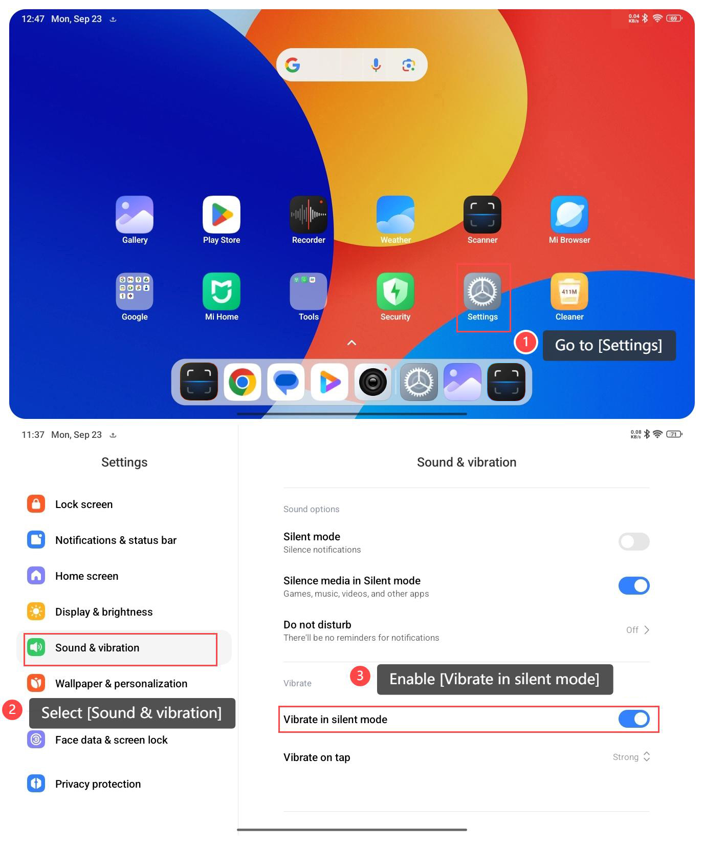 ในการตั้งค่า การสั่นในโหมดเงียบบนแท็บเล็ตของคุณ โปรดดูขั้นตอนต่อไปนี้:
