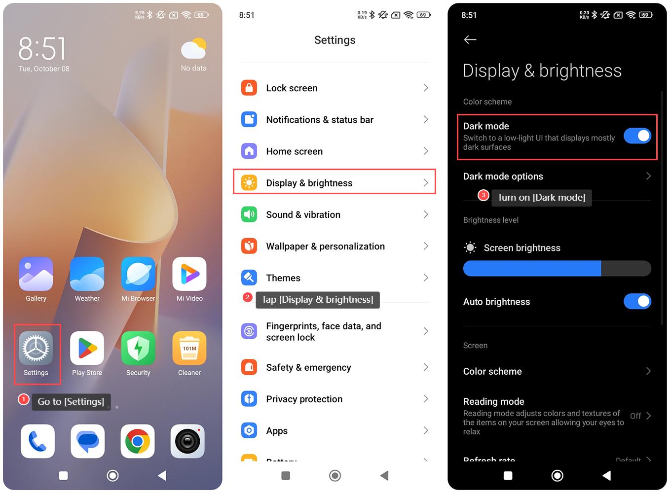 ในการตั้งค่าโหมดมืดบน REDMI 13C โปรดดูวิธีการต่อไปนี้:
