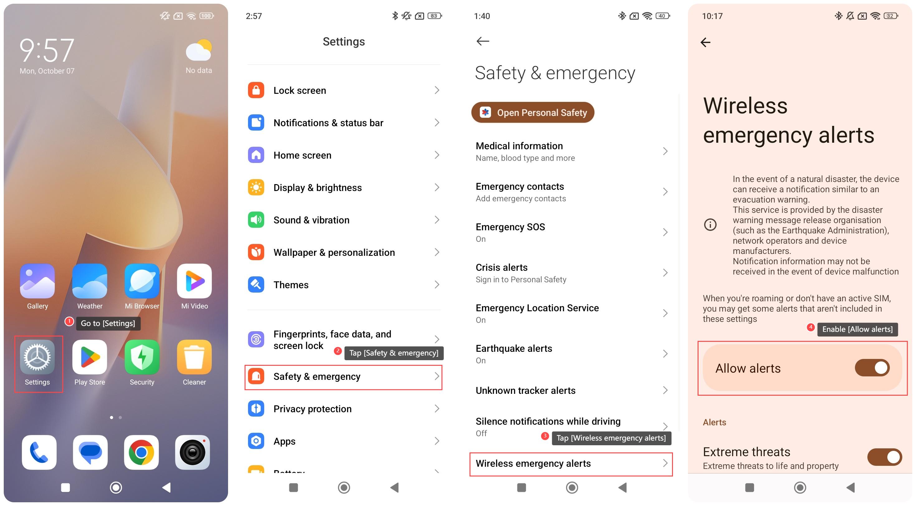 การแจ้งเตือนฉุกเฉินแบบไร้สาย (WEA) บน REDMI 13C เป็นข้อความฉุกเฉินสั้น ๆ ที่ส่งโดยหน่วยงานของรัฐที่ได้รับอนุญาตเพื่อแจ้งเตือนคุณเกี่ยวกับสถานการณ์วิกฤต การแจ้งเตือนเหล่านี้อาจรวมถึงภัยคุกคามที่รุนแรงภัยคุกคามรุนแรงการแจ้งเตือนสีเหลืองอําพันและการแจ้งเตือนการทดสอบ