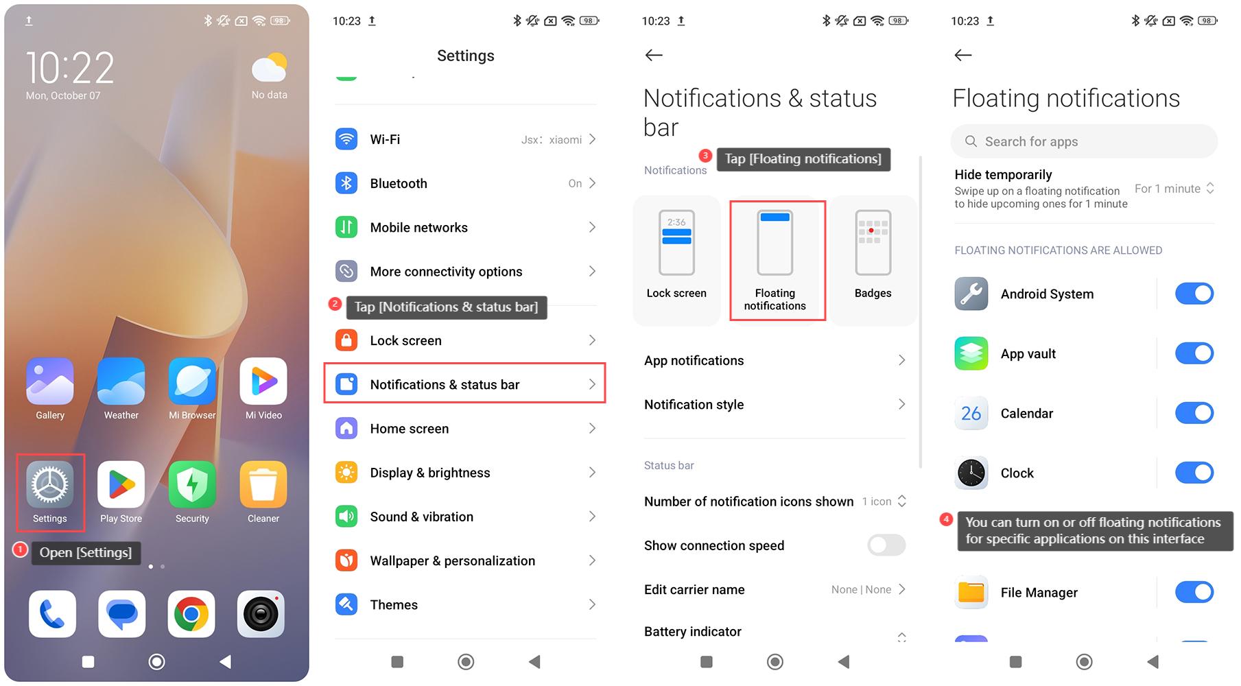 ในการจัดการการแจ้งเตือนแบบลอยบน REDMI 13C 5G โปรดดูขั้นตอนต่อไปนี้: