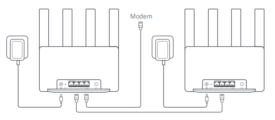 2. เชื่อมต่อพอร์ตใดก็ได้ของเราเตอร์ดาวเทียมและพอร์ตใดๆ ของเราเตอร์หลักผ่านสายเคเบิลเครือข่าย ไฟแสดงสถานะของเราเตอร์หลักและเราเตอร์ดาวเทียมจะเริ่มกะพริบ จะใช้เวลาประมาณ 2 นาทีในการทําเครือข่าย Mesh ให้เสร็จสมบูรณ์