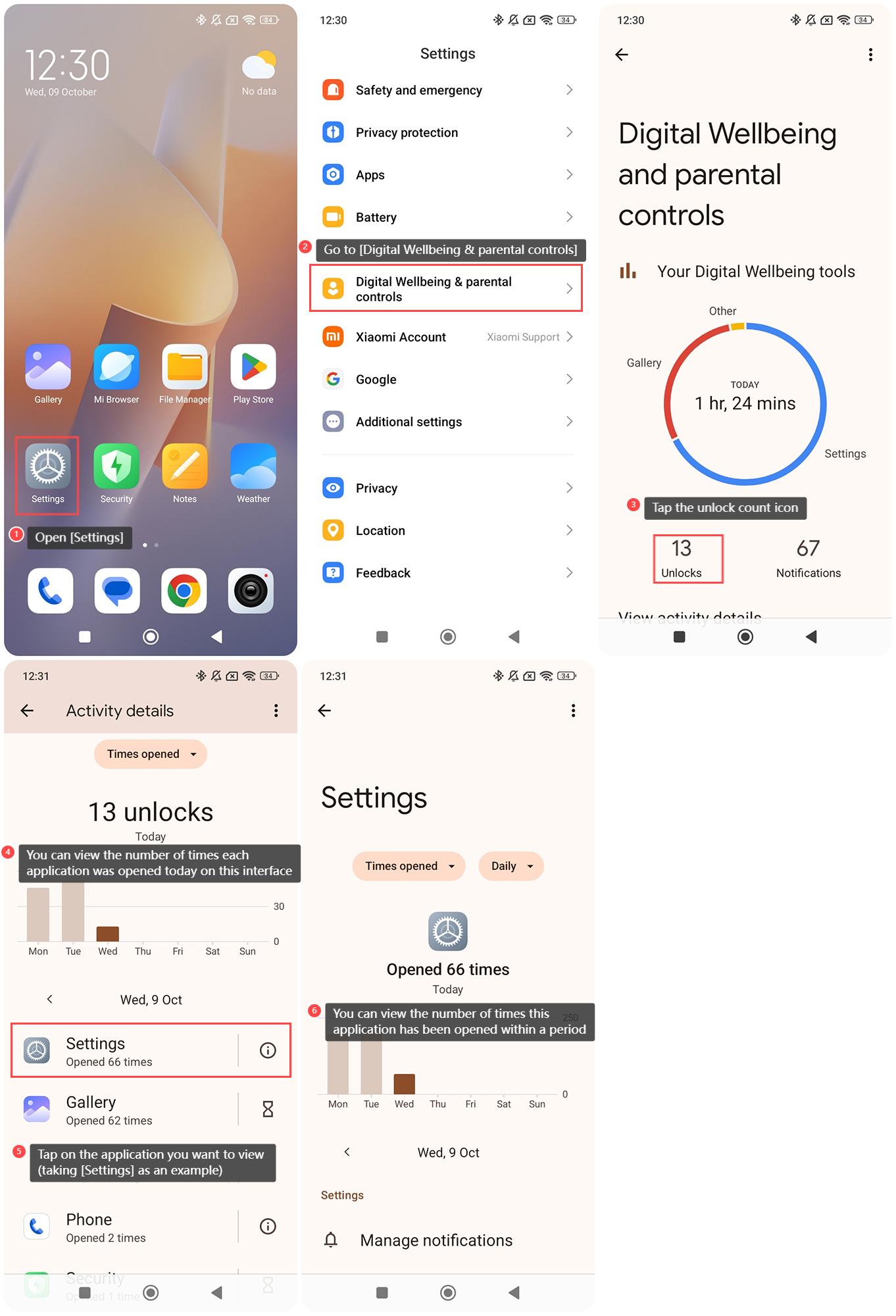หากต้องการตรวจสอบจํานวนครั้งที่คุณเปิดแอปพลิเคชันบน REDMI 13C 5G โปรดดูขั้นตอนต่อไปนี้: