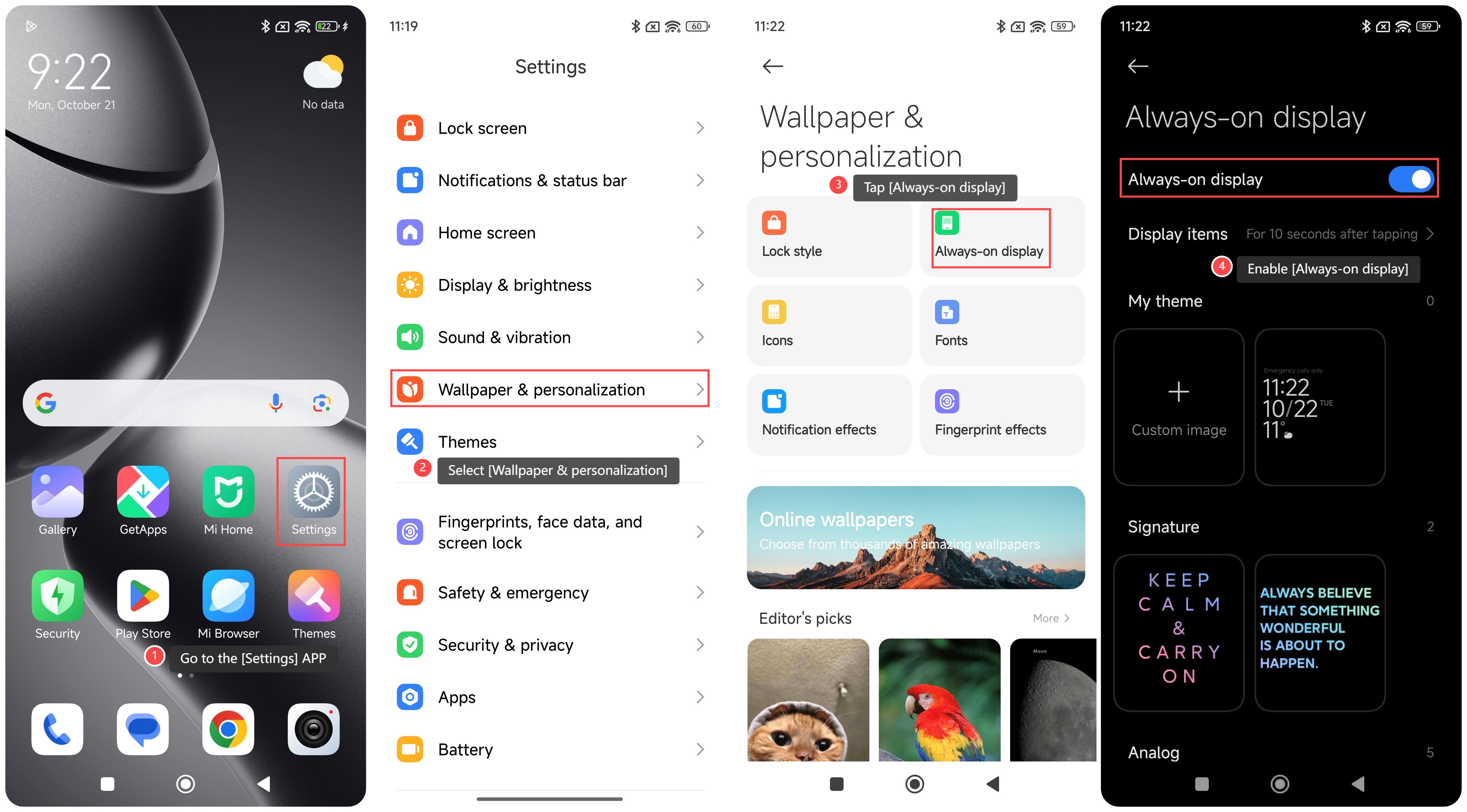 ในการตั้งค่า AOD บนโทรศัพท์ของคุณ โปรดดูขั้นตอนต่อไปนี้: