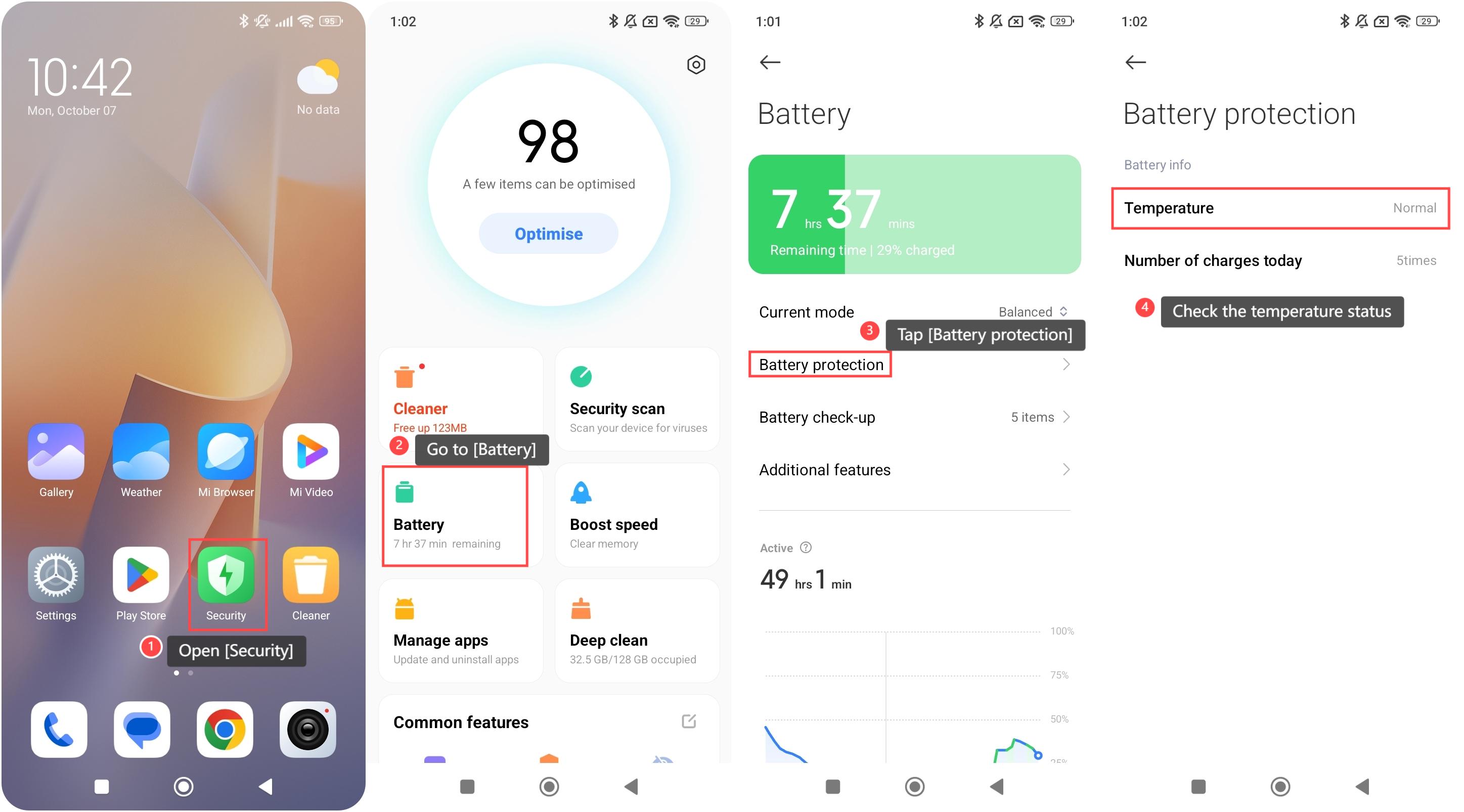 อุณหภูมิแบตเตอรี่ของ REDMI 13C หมายถึงระดับความร้อนของแบตเตอรี่ของอุปกรณ์ระหว่างการใช้งานหรือการชาร์จ ความร้อนที่มากเกินไปอาจทําให้ประสิทธิภาพของแบตเตอรี่ลดลงอายุการใช้งานสั้นลงและความเสี่ยงด้านความปลอดภัยที่อาจเกิดขึ้นเช่นอาการบวมหรือการรั่วไหล การตรวจสอบอุณหภูมิของแบตเตอรี่เป็นสิ่งสําคัญ โดยเฉพาะอย่างยิ่งในระหว่างการใช้งานหนัก การเล่นเกม หรือการชาร์จ เนื่องจากกิจกรรมเหล่านี้สามารถสร้างความร้อนเพิ่มเติมได้ หากต้องการตรวจสอบอุณหภูมิแบตเตอรี่ของ