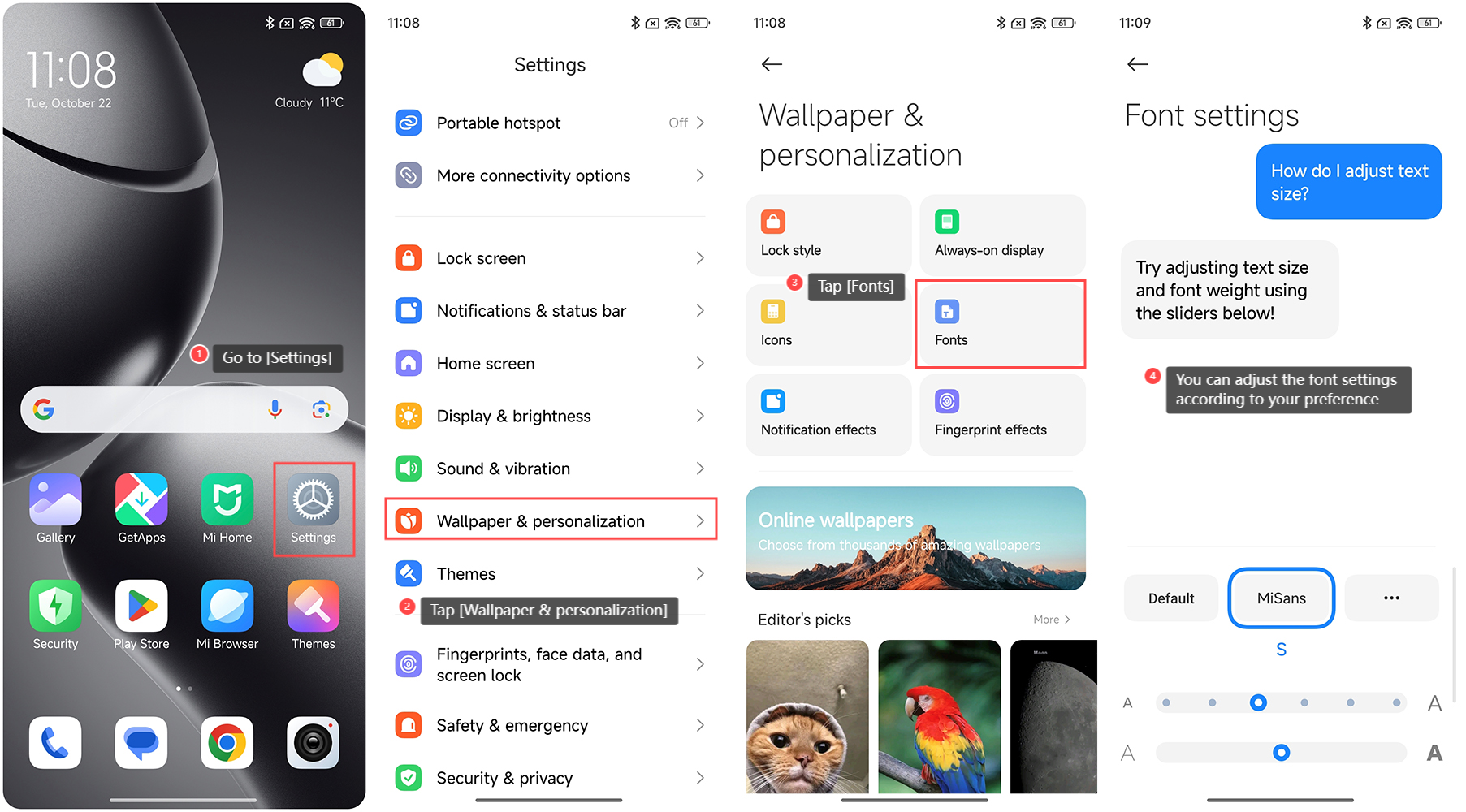 ในการปรับการตั้งค่าแบบอักษรบน Xiaomi 14T โปรดดูวิธีการต่อไปนี้: