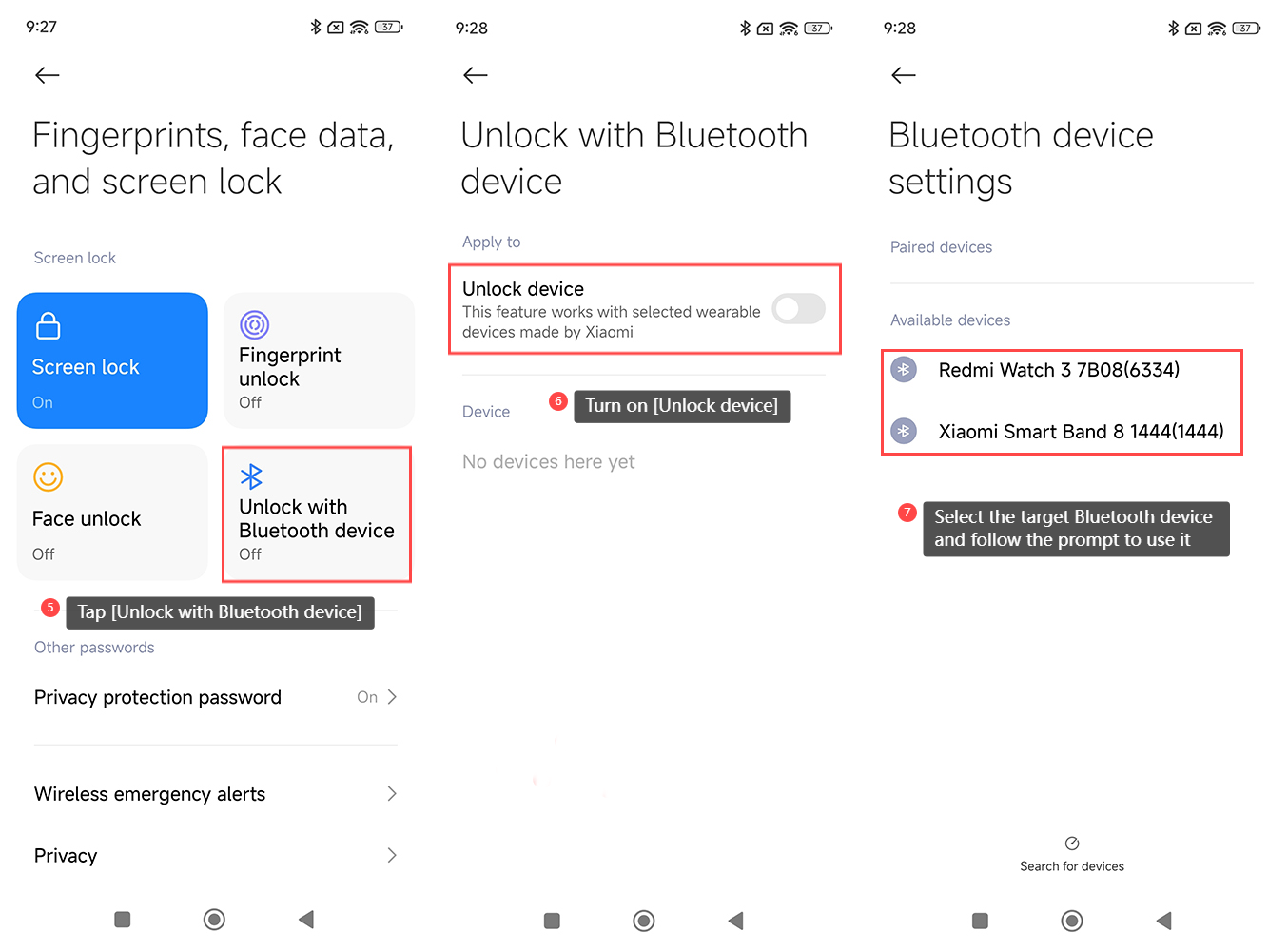 หากต้องการปลดล็อก Xiaomi 14T Pro ด้วยอุปกรณ์ Bluetooth โปรดดูขั้นตอนต่อไปนี้: