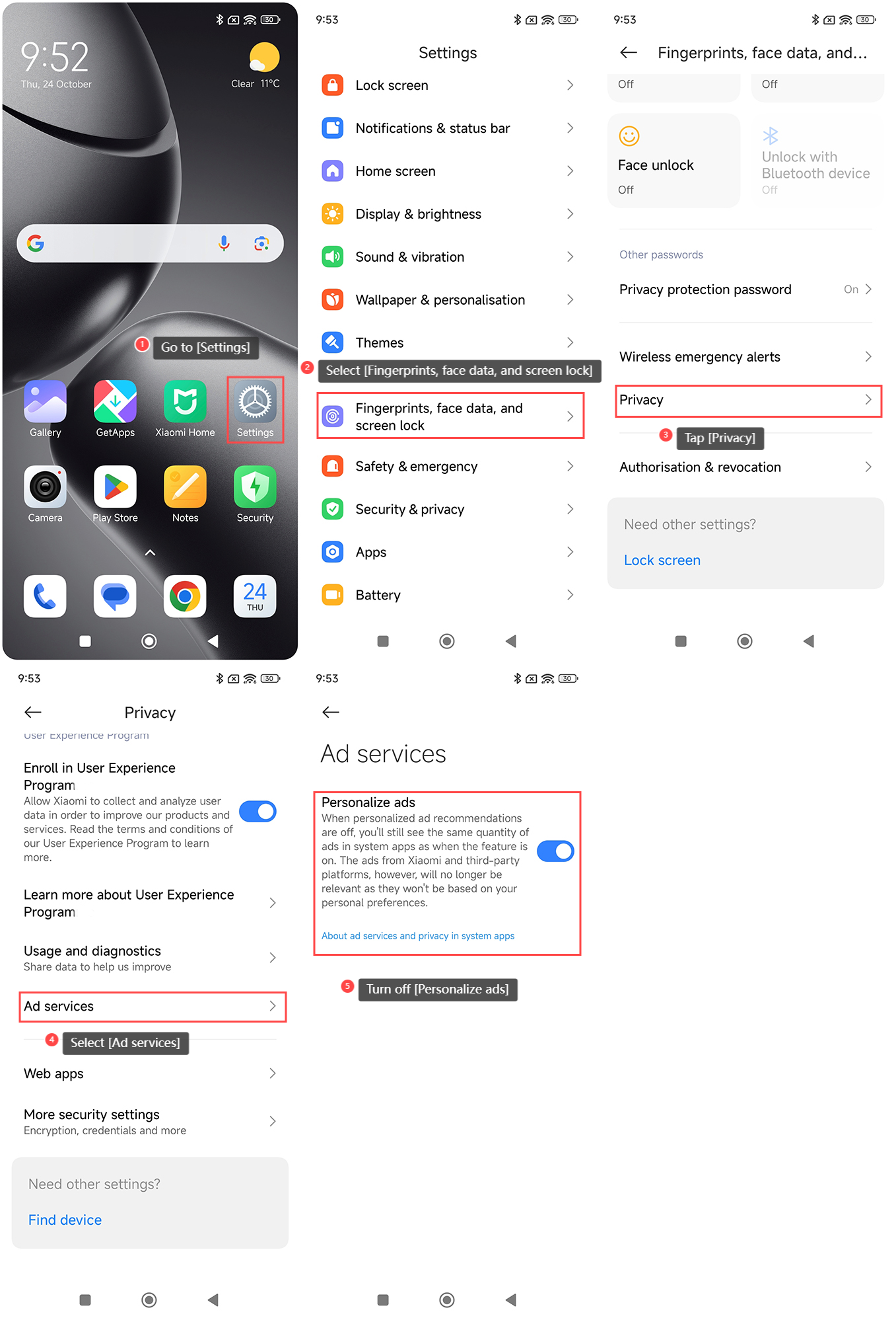 หากต้องการปิดปรับแต่งโฆษณาบน Xiaomi 14T Pro โปรดดูขั้นตอนต่อไปนี้: