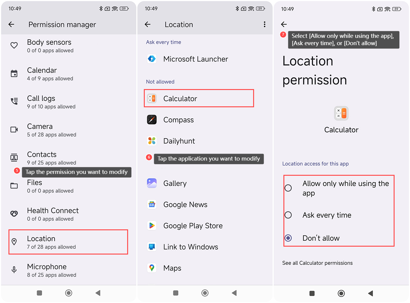 7. เลือก [อนุญาตเฉพาะขณะใช้แอป], [ถามทุกครั้ง] หรือ [ไม่อนุญาต]