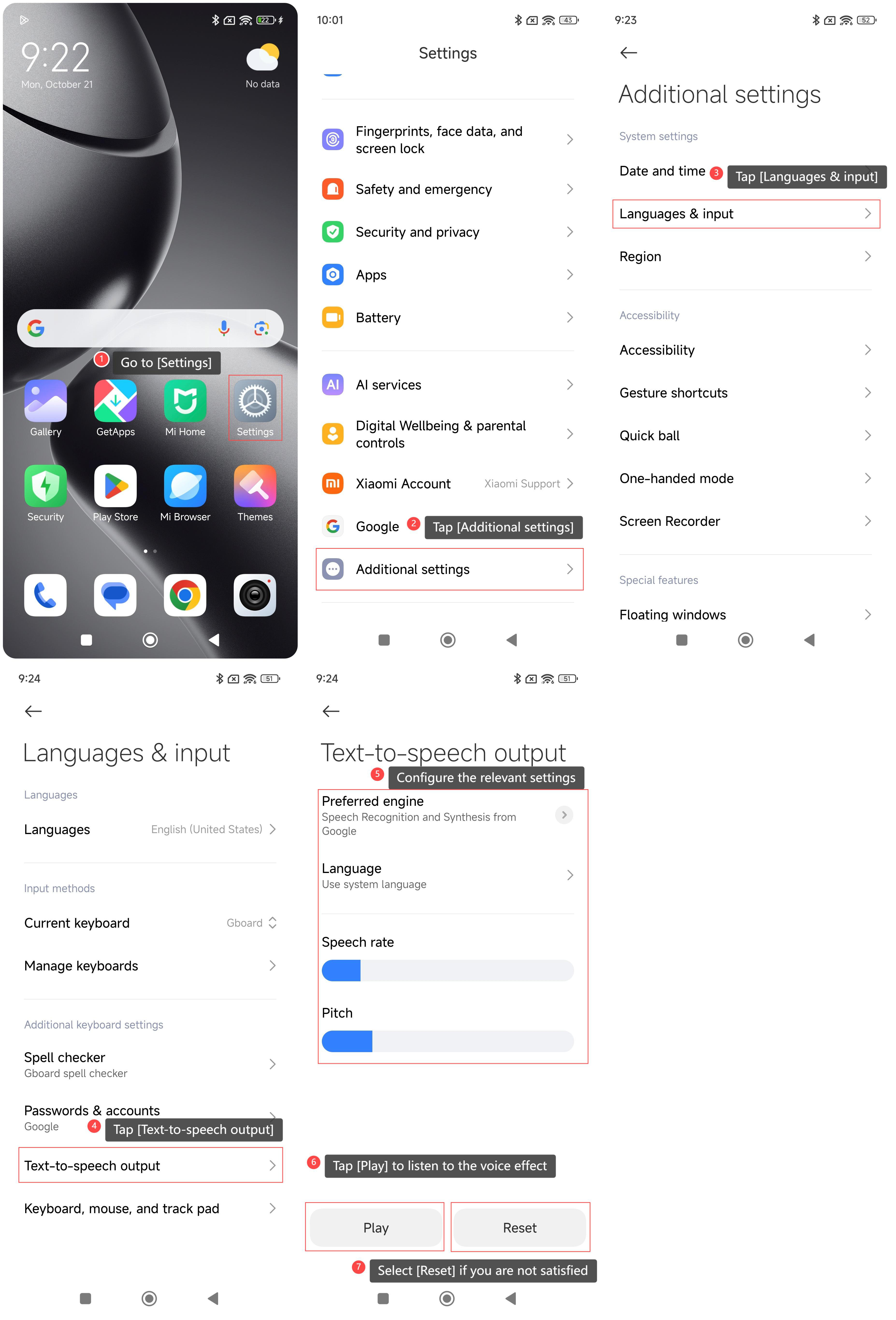 ในการตั้งค่าเอาต์พุตการแปลงข้อความเป็นคําพูดบนโทรศัพท์ของคุณ โปรดดูขั้นตอนต่อไปนี้: