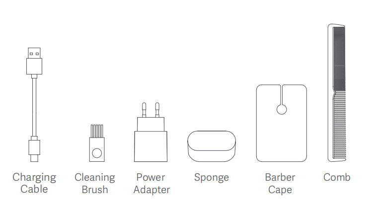 มี Xiaomi Hair Clipper 2, หวีปรับได้ 2-14 มม., หวีปรับได้ 16-28 มม., สายชาร์จ, แปรงทําความสะอาด, อะแดปเตอร์แปลงไฟ (สําหรับมาตรฐานยุโรปเท่านั้น), ฟองน้ํา, เสื้อคลุมตัดผมและหวี