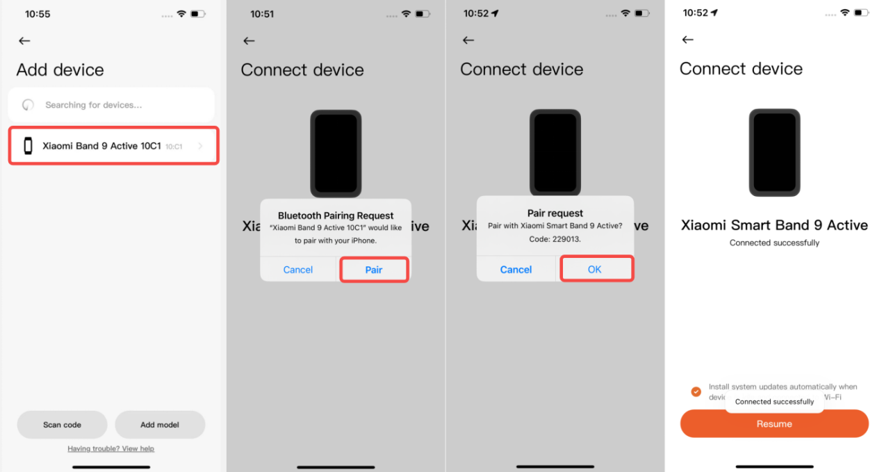 วิธีที่ 2: เพิ่มตามรุ่น ไปที่อินเทอร์เฟซ Mi Fitness APP >>แตะไอคอน [+] ที่มุมขวาบน >> [เพิ่มอุปกรณ์] >> [เพิ่ม รุ่น] >>เลือก Xiaomi Smart Band 9 Active. มันจะค้นหาอุปกรณ์ที่ใกล้ที่สุดโดยอัตโนมัติและขอเชื่อมต่อกับวงดนตรี หลังจากเชื่อมต่อกับวงดนตรีแล้ว ไอคอนเครื่องหมายถูกจะแสดงบนวงดนตรี แตะไอคอนเครื่องหมายถูก แตะ [จับคู่] บนโทรศัพท์เพื่อยืนยันการผูก และแตะ [ยกเลิก] เพื่อยกเลิกการจับคู่