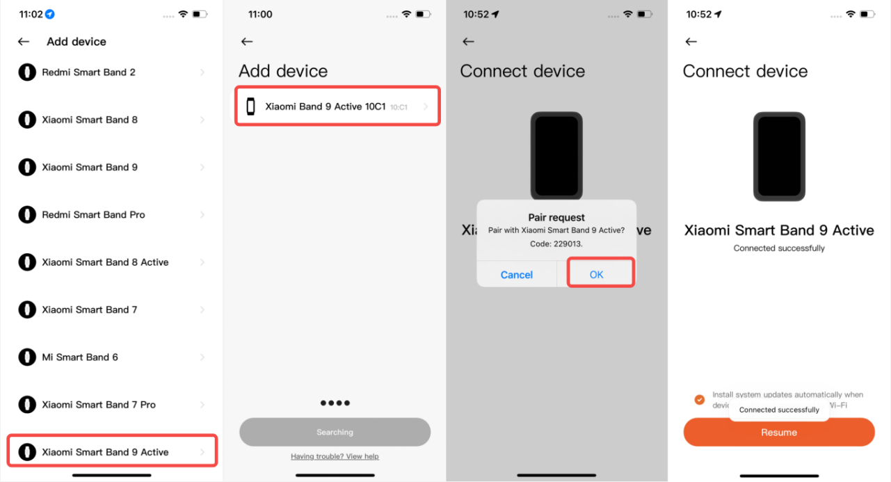 วิธีที่ 1: เพิ่มโดยการค้นหาอัตโนมัติ ไปที่อินเทอร์เฟซแอป Mi Fitness >>แตะไอคอน [+] ที่มุมขวาบน>> [อุปกรณ์ Add] >>วางโทรศัพท์และวงดนตรีไว้ข้างๆ กันเพื่อค้นหาและผูก เลือกอุปกรณ์บนโทรศัพท์ที่ตรงกับตัวเลขสี่หลักสุดท้ายของที่อยู่ Bluetooth ของวงดนตรี หลังจากเชื่อมต่อกับวงดนตรีแล้ว ไอคอนเครื่องหมายถูกจะแสดงบนวงดนตรี แตะไอคอนเครื่องหมายถูกเพื่อยืนยันการผูก
