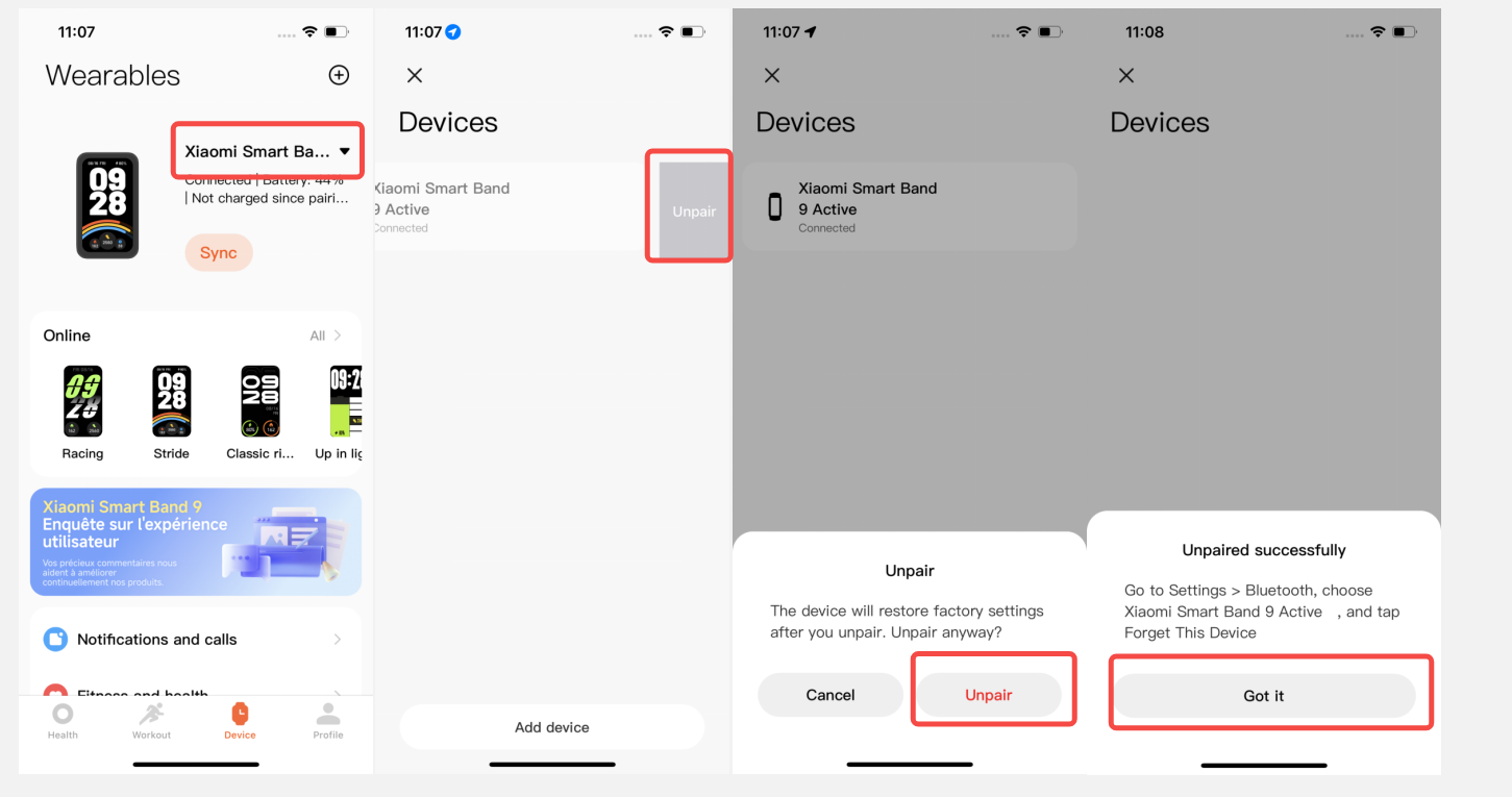 วิธีที่ 1: เลิกผูกจากรายการการจัดการอุปกรณ์ เมื่อวงดนตรีเชื่อมต่อกับโทรศัพท์มือถือ ให้เปิดแอป Mi Fitness >> [อุปกรณ์] >>แตะไอคอนสามเหลี่ยมข้างอุปกรณ์เพื่อ view อุปกรณ์ทั้งหมด>>กดอุปกรณ์ปัจจุบันค้างไว้>>แตะ [เลิกจับคู่] เพื่อยกเลิกการผูก หลังจากปลดสายรัดแล้ว วงดนตรีจะกลับสู่การตั้งค่าจากโรงงาน