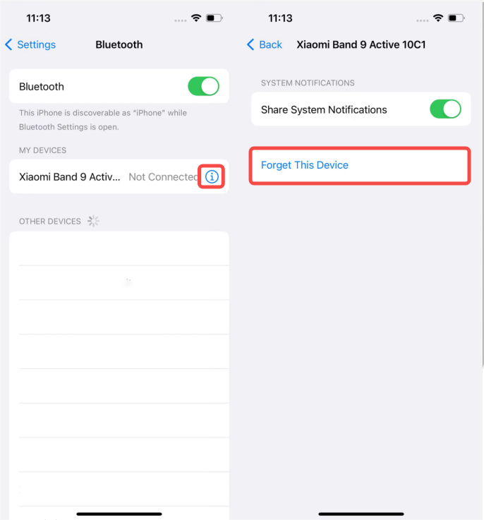 ก่อนที่จะผูกอุปกรณ์เดิมในครั้งต่อไปในแอป Mi Fitness บนโทรศัพท์ iOS คุณต้องเลือกอุปกรณ์ในการตั้งค่า Bluetooth ของระบบแล้วแตะ [ลืม T his D evice] ก่อน ดังแสดงในรูปด้านล่าง มิฉะนั้น จะไม่สามารถผูกอุปกรณ์ปัจจุบันได้