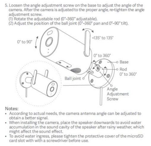 5. ถาม: การติดตั้งติดผนังกล้องกลางแจ้ง Xiaomi AW300 มีขั้นตอนอะไรบ้าง?ตอบ: โปรดทราบ: เมื่อทําการติดตั้ง ลําโพงต้องคว่ําหน้าลง เพื่อหลีกเลี่ยงสภาพอากาศที่ฝนตก ช่องลําโพงจะสะสมน้ํา ส่งผลต่อเอฟเฟกต์เสียงและความเสี่ยงที่น้ําจะเข้าภายใน ตรวจสอบให้แน่ใจว่าได้ขันฝาครอบช่องเสียบการ์ด SD ให้แน่นด้วยไขควงก่อนใช้งานเพื่อหลีกเลี่ยงไม่ให้น้ําเข้า