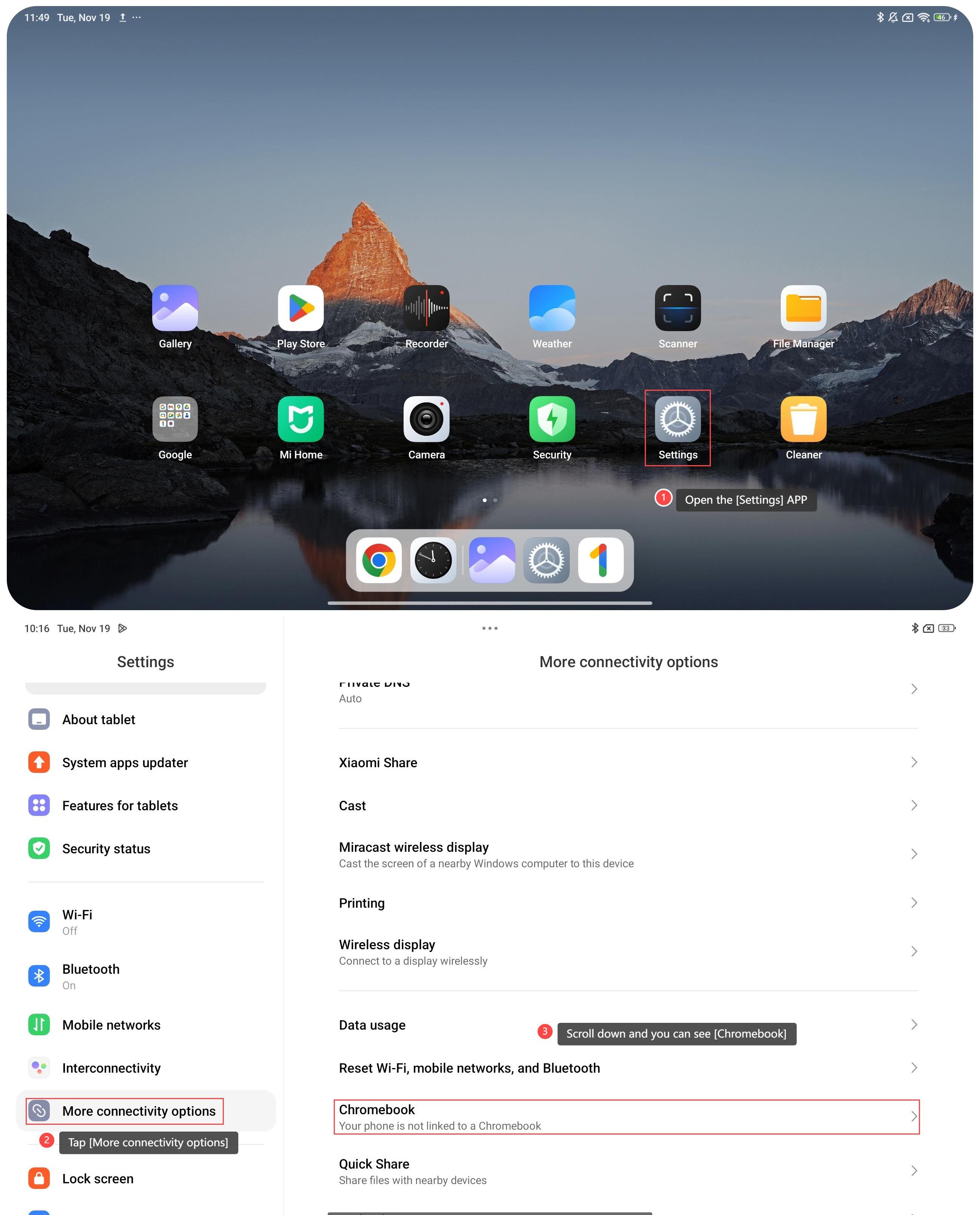 หากต้องการเชื่อมโยงแท็บเล็ตของคุณกับ Chromebook โปรดดู ขั้นตอนต่อไปนี้:
