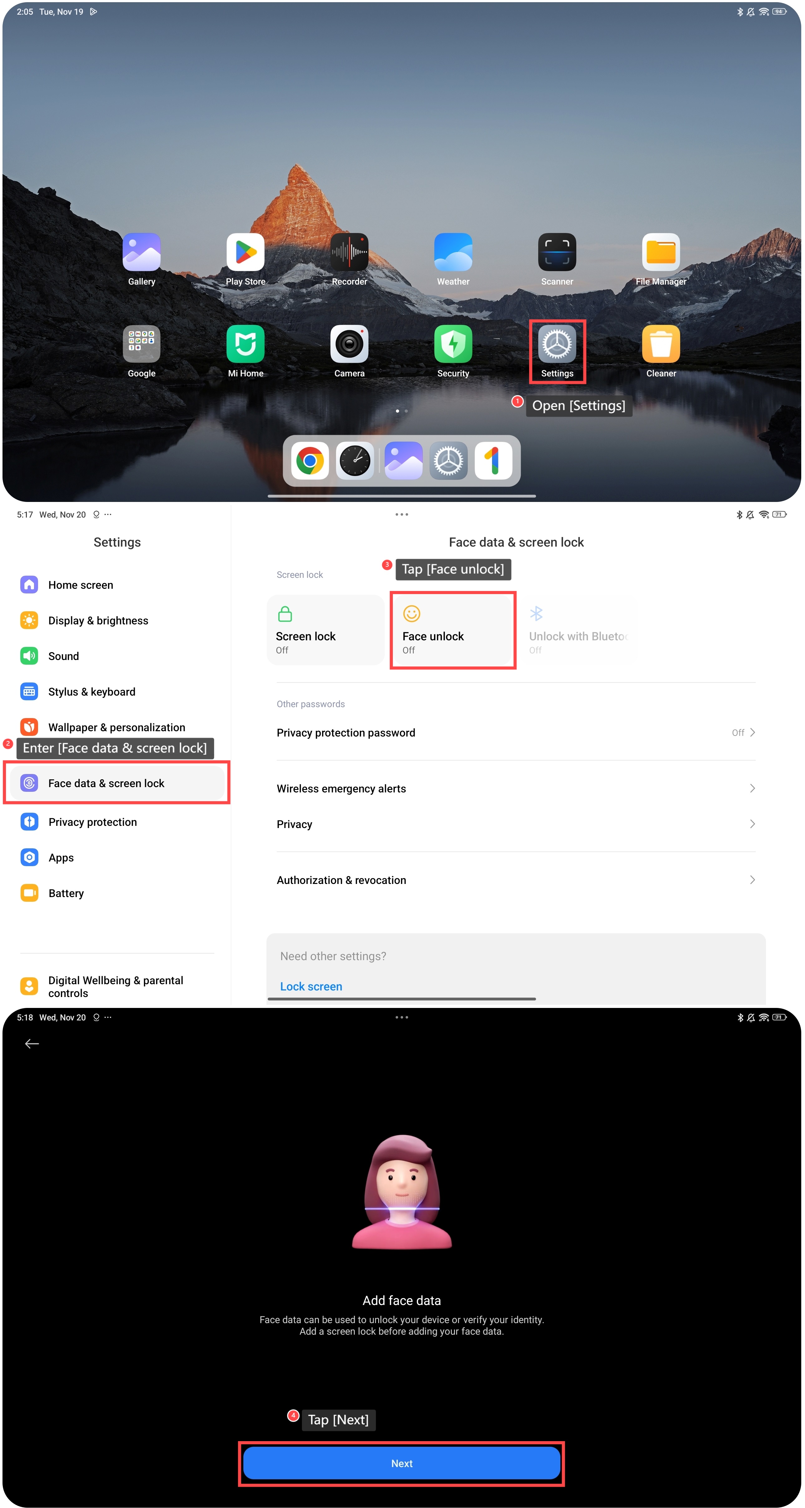 ในการตั้งค่าการปลดล็อกด้วยใบหน้าบนแท็บเล็ต โปรดดูขั้นตอนต่อไปนี้: