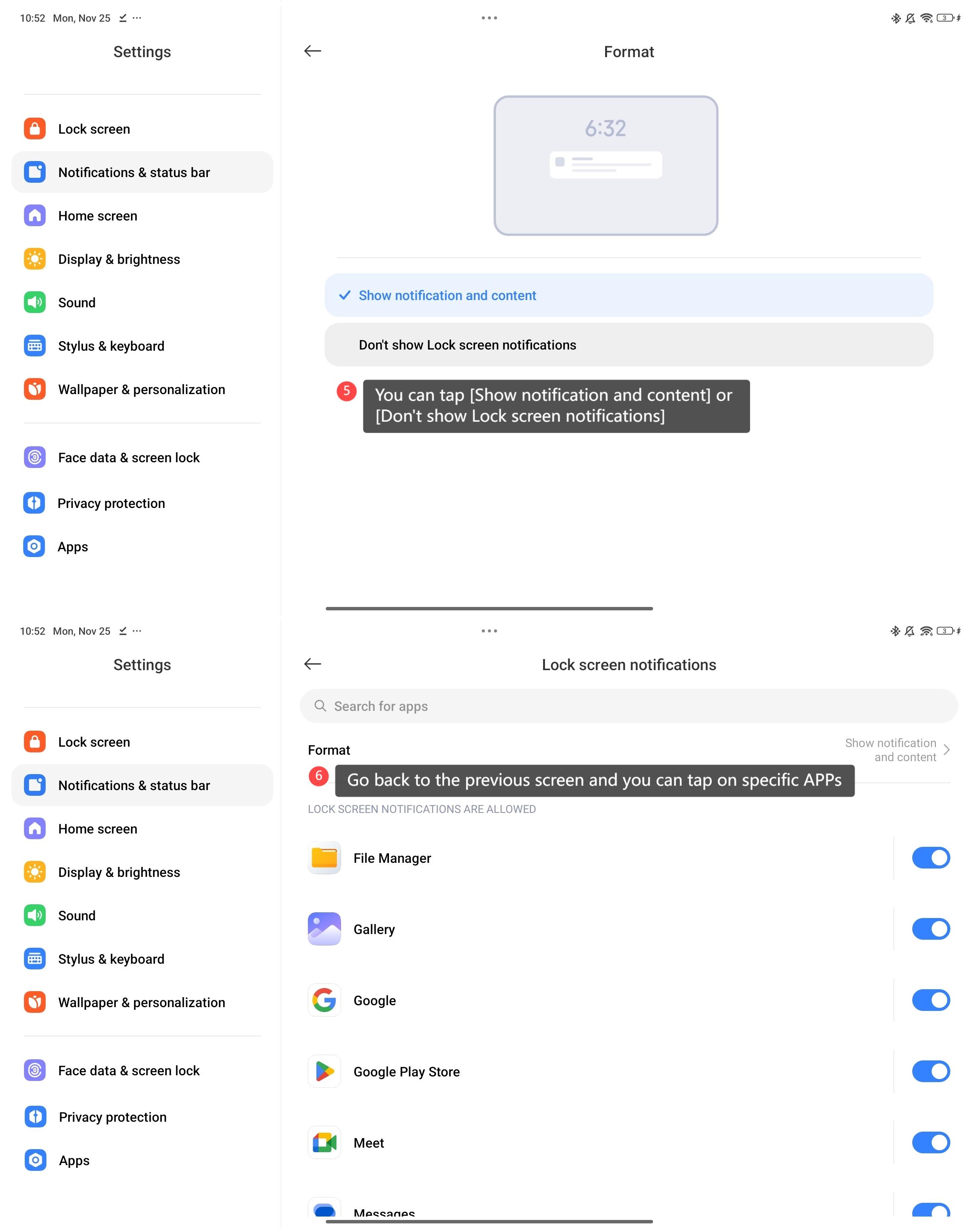 6. คุณสามารถเลือก [แสดงการแจ้งเตือนและเนื้อหา]  หรือ [ไม่แสดงการแจ้งเตือนหน้าจอล็อก];