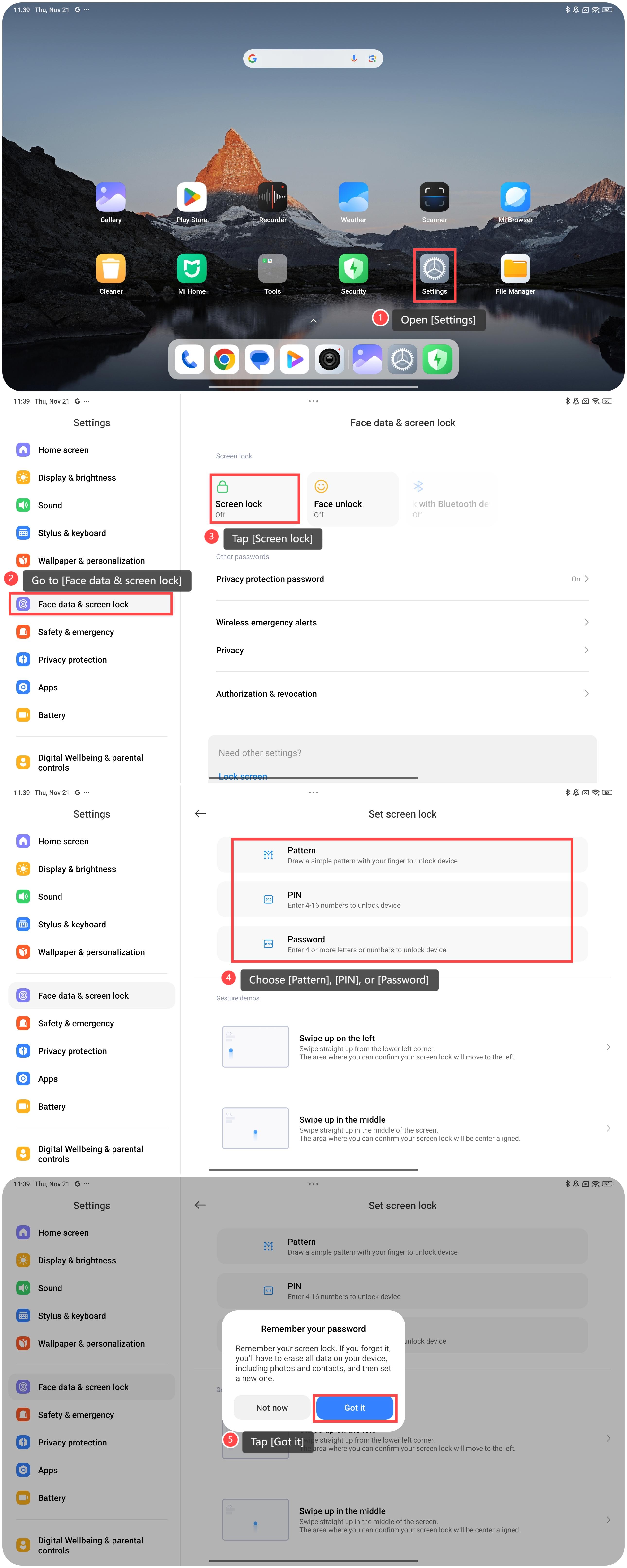 ในการตั้งค่าการล็อกหน้าจอ โปรดดูขั้นตอนต่อไปนี้: