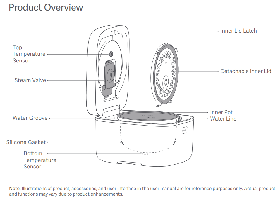 มีเซ็นเซอร์อุณหภูมิด้านบน, วาล์วไอน้ํา, ร่องน้ํา, ปะเก็นซิลิโคน, เซ็นเซอร์อุณหภูมิด้านล่าง, สลักฝาด้านใน, ฝาด้านในที่ถอดออกได้, หม้อชั้นใน และท่อส่งน้ํา