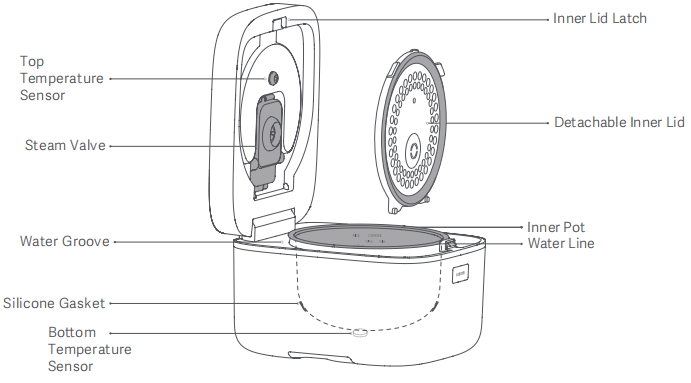 มีเซ็นเซอร์อุณหภูมิด้านบน, วาล์วไอน้ํา, ร่องน้ํา, ปะเก็นซิลิโคน, เซ็นเซอร์อุณหภูมิด้านล่าง, สลักฝาด้านใน, ฝาด้านในที่ถอดออกได้, หม้อชั้นใน และท่อส่งน้ํา