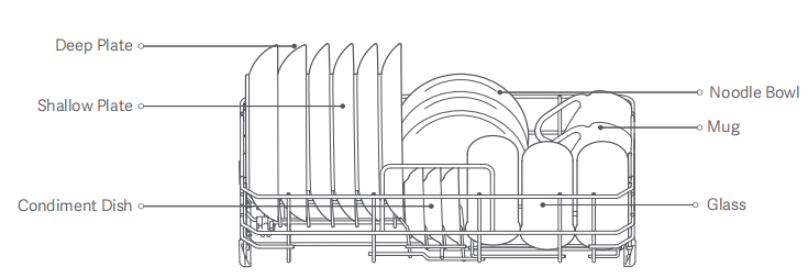 ในเครื่องใช้บนโต๊ะอาหาร ห้ามวางชาม ถ้วย จาน หรือเครื่องใช้บนโต๊ะอาหารอื่นๆ ให้ตั้งตรง คว่ํา หรือทับซ้อนกัน มิฉะนั้นน้ําจะสะสมซึ่งไม่เอื้อต่อการทําความสะอาดหรือทําให้แห้ง หลังจากวางเครื่องใช้บนโต๊ะอาหารลงในชั้นวางจานแล้ว ให้หมุนแขนสเปรย์เพื่อให้แน่ใจว่าไม่สัมผัสกับเครื่องใช้บนโต๊ะอาหารใดๆ