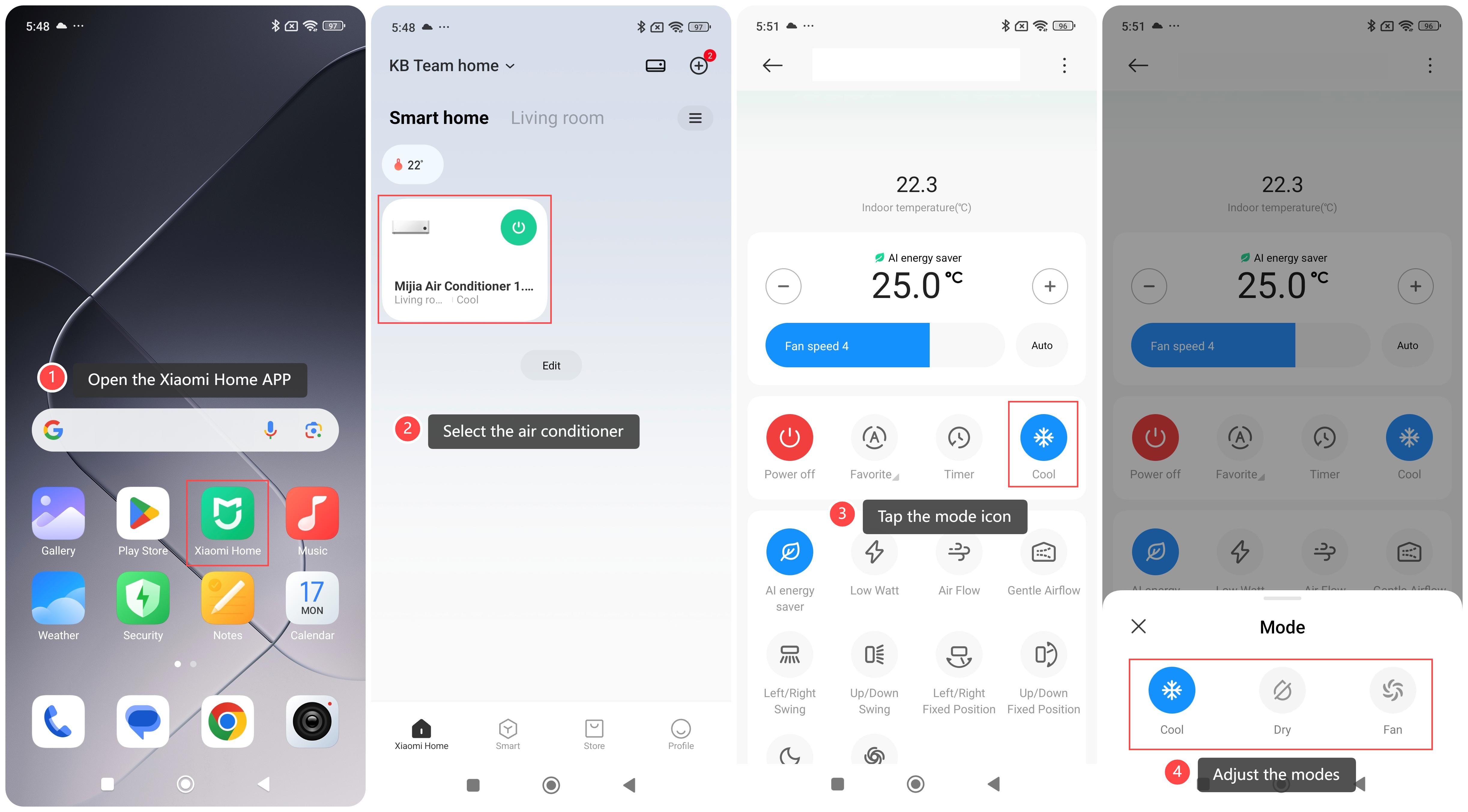 4. ปรับโหมด: [เย็น], [ แห้ง] และ [พัดลม]