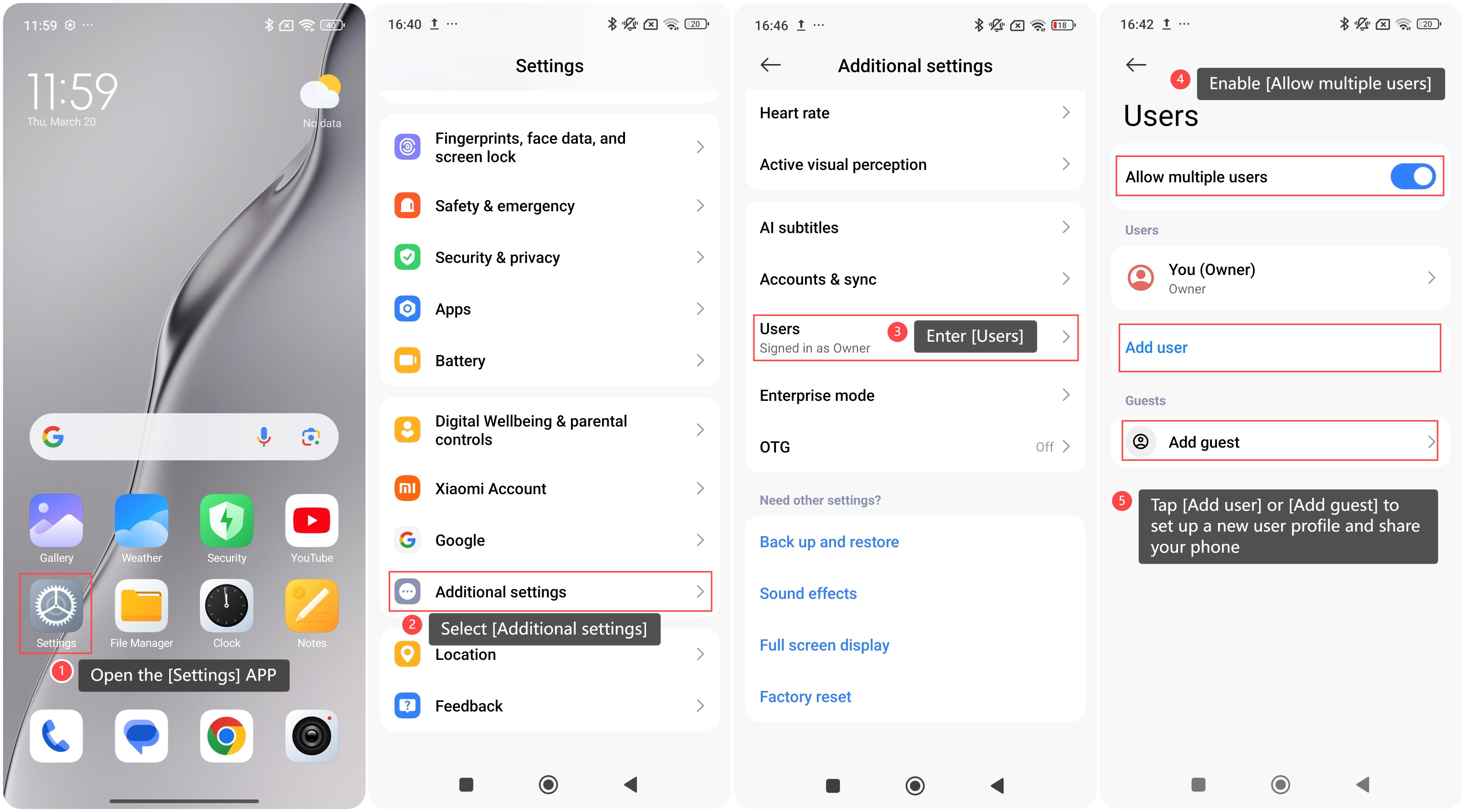 สมาร์ทโฟน Xiaomi ช่วยให้คุณสามารถแชร์โทรศัพท์ของคุณกับผู้อื่นได้โดยการเพิ่มผู้ใช้ใหม่ ผู้ใช้แต่ละคนมีพื้นที่ส่วนตัวพร้อมหน้าจอหลัก บัญชี แอป การตั้งค่า และอื่นๆ ของตนเอง