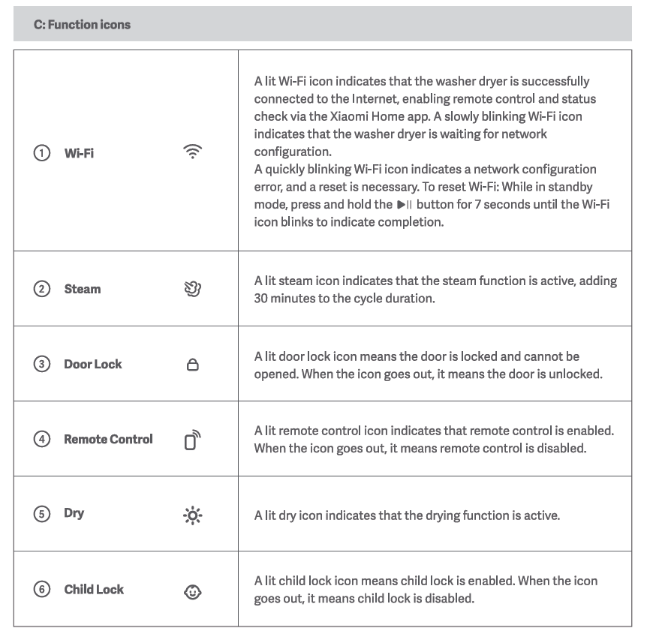 1. ไอคอน Wi-Fi ที่สว่างแสดงว่าเครื่องซักผ้าอบผ้าเชื่อมต่อกับอินเทอร์เน็ตสําเร็จ ทําให้สามารถควบคุมระยะไกลและตรวจสอบสถานะผ่านแอป Mi Home/Xiaomi Home ได้ ไอคอน Wi-Fi กะพริบช้าๆ แสดงว่าเครื่องซักผ้าอบผ้ากําลังรอการกําหนดค่าเครือข่าย ไอคอน Wi-Fi ที่กะพริบอย่างรวดเร็วบ่งบอกถึงข้อผิดพลาดในการกําหนดค่าเครือข่าย และจําเป็นต้องรีเซ็ต ในการรีเซ็ต Wi-Fi: ขณะอยู่ในโหมดสแตนด์บาย ให้กดปุ่มค้างไว้ 7 วินาทีจนกระทั่งไอคอน Wi-Fi กะพริบเพื่อระบุว่าเสร็จสิ้น