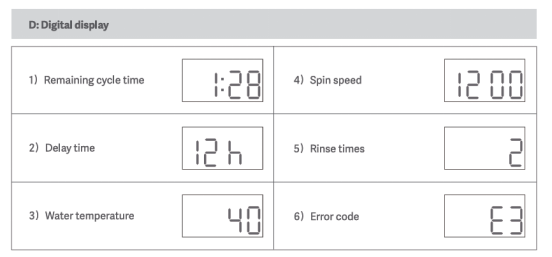 ความหมายของจอแสดงผลดิจิตอลทางด้านซ้ายของแผงบน Mijia Front Load Washer Dryer 10.5kg มีดังนี้: