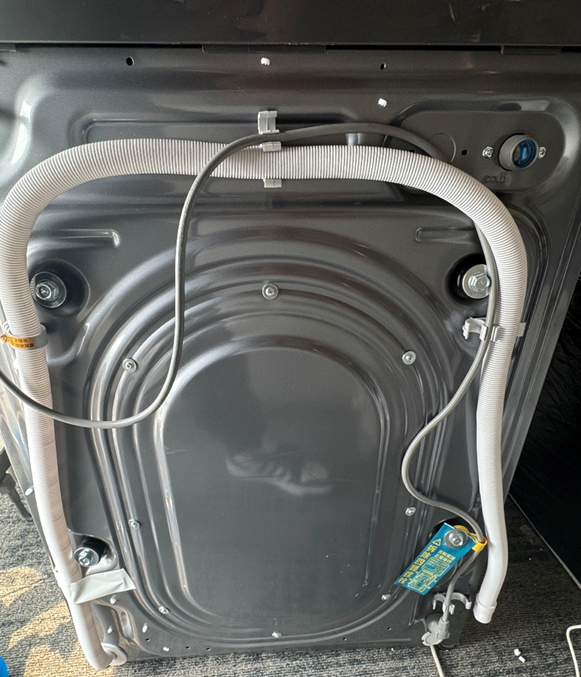(1). ปิดก๊อกน้ําและถอดสายไฟ คลายและถอดท่อน้ําเข้าออกจากด้านหลังของเครื่องซักผ้าอบผ้า คลุมพอร์ตด้วยผ้าเพื่อป้องกันไม่ให้น้ําพ่นออกมา