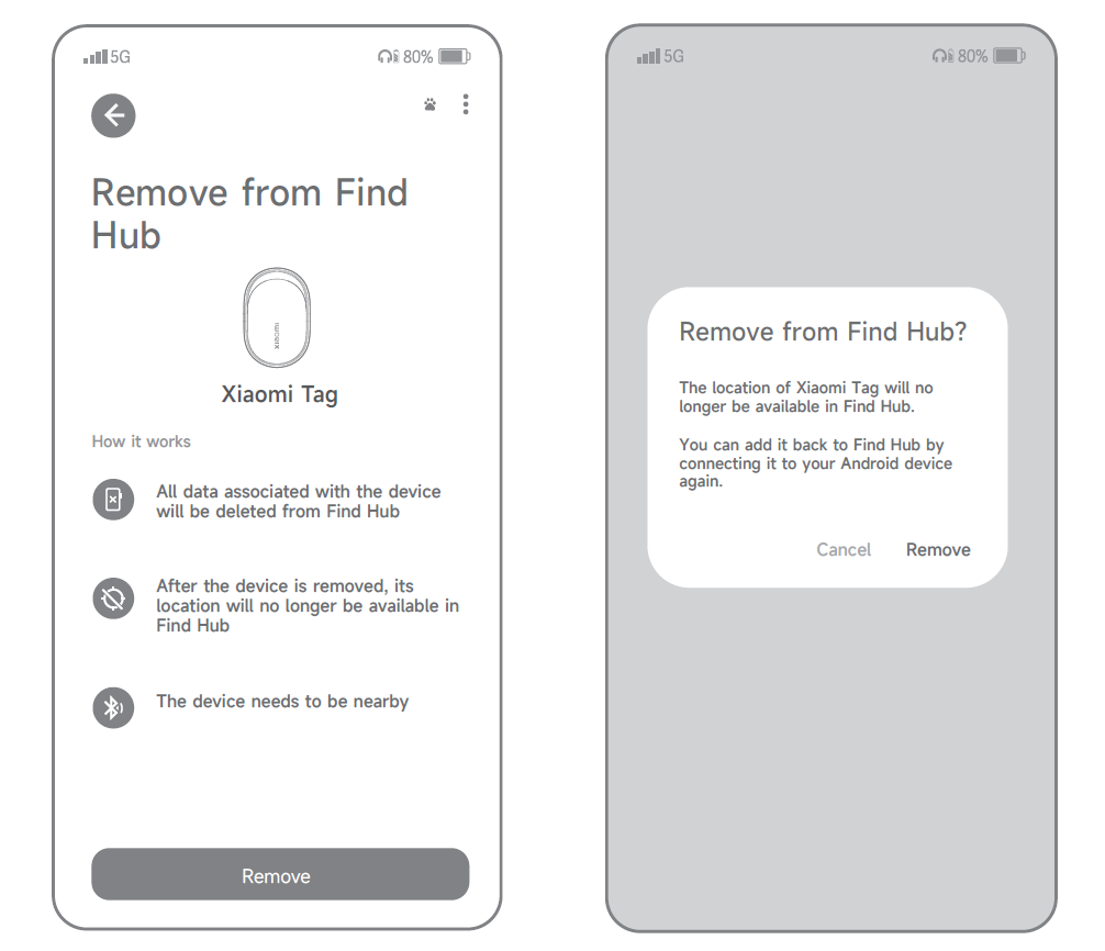 1. เมื่อ Xiaomi Tag เชื่อมต่อกับ Google’s Find Hub App หรือ Find My App แล้ว คุณสามารถลบและยกเลิกการผูกอุปกรณ์ออนไลน์ผ่าน App ได้ โปรดทราบว่าการยกเลิกการผูกอุปกรณ์ขณะที่อุปกรณ์ออฟไลน์จะลบเพียงการเชื่อมโยงกับคลาวด์ และจะไม่รีเซ็ตตัวอุปกรณ์เอง