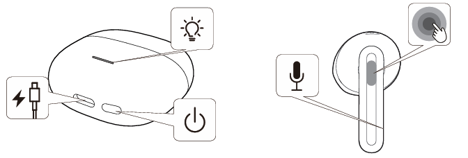 2. การชาร์จเคส: ใช้สาย Type-C เพื่อชาร์จเคส ไฟแสดงสถานะสีขาวจะติดค้างระหว่างการชาร์จ และจะดับลงเมื่อชาร์จเต็มแล้ว.