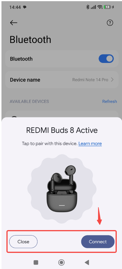 1. เมื่อค้นหาหูฟัง Bluetooth บนโทรศัพท์ของคุณ ให้แน่ใจว่า REDMI Buds 8 Active อยู่ในโหมดจับคู่.