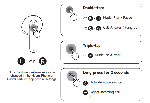การตั้งค่า Gesture สามารถเปลี่ยนได้ใน Xiaomi Phone หรือการตั้งค่า gesture ของ Xiaomi Earbuds App.
