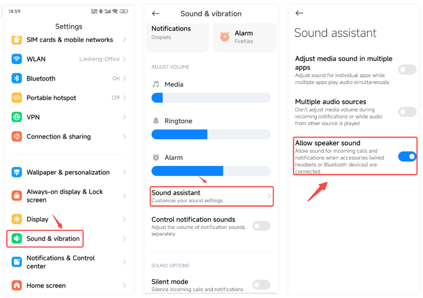 บนโทรศัพท์ Xiaomi ที่ใช้ MIUI 13 หรือใหม่กว่า ไปที่ การตั้งค่า >> [เสียงและการสั่น] >> [ผู้ช่วยเสียง] >> ปิด [อนุญาตเสียงลำโพง] หลังจากปิดใช้งานตัวเลือกนี้แล้ว เสียงจะเล่นผ่าน REDMI Buds 8 Active เท่านั้น