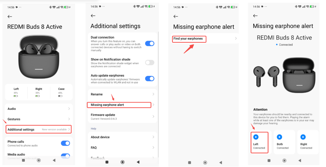 บนโทรศัพท์ Xiaomi ให้แตะลูกศรถัดจาก REDMI Buds 8 Active ในอินเทอร์เฟซ Bluetooth ของระบบเพื่อเข้าสู่ [การตั้งค่าเพิ่มเติม] >> [การแจ้งเตือนหูฟังหาย] >> [ค้นหาหูฟังของคุณ] >> เลือก [ซ้าย], [ทั้งสองข้าง] หรือ [ขวา].