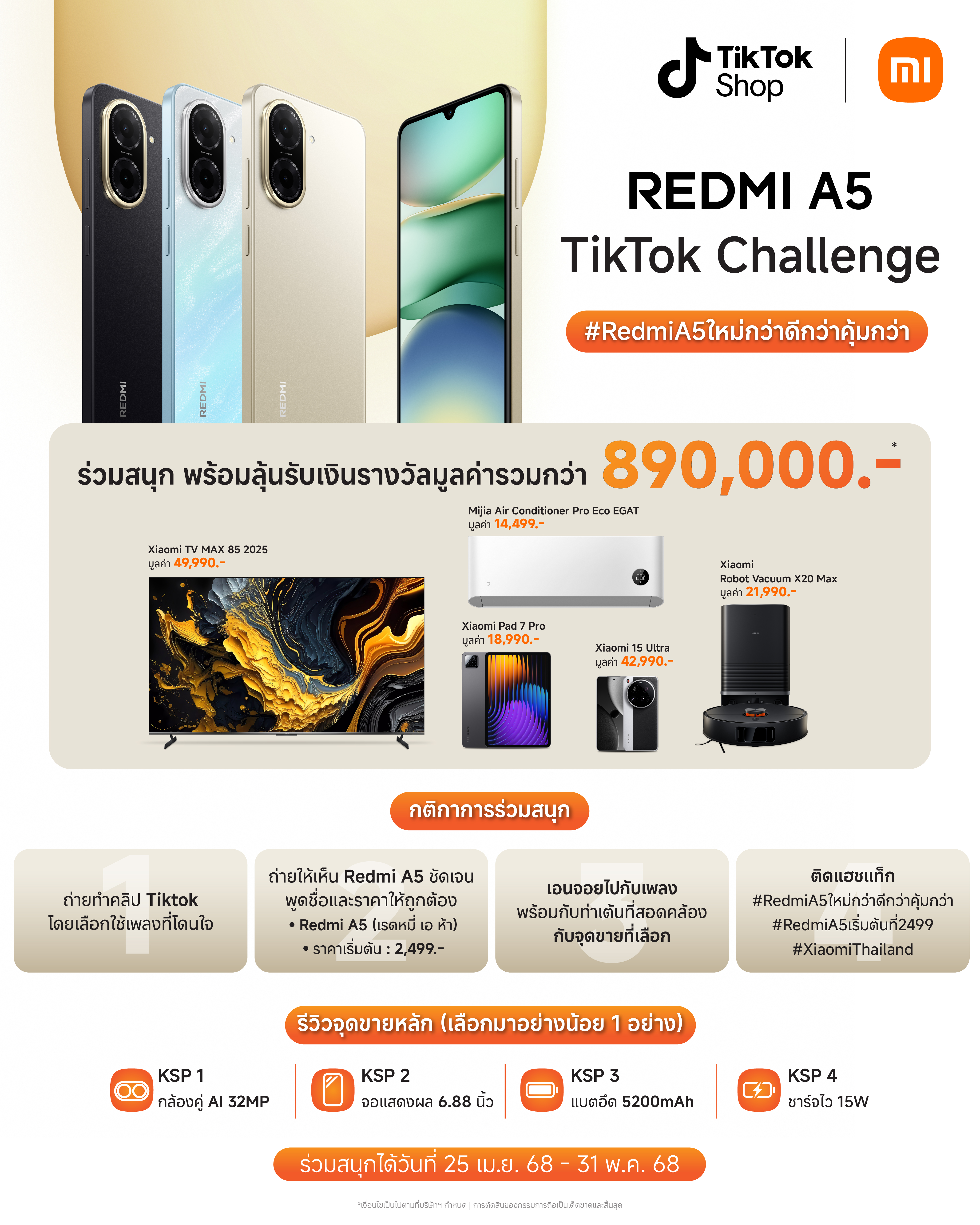 แคมเปญเรดหมี่ เอ 5 ติ๊กต๊อก ชาเลนจ์ #REDMIA5ใหม่กว่าดีกว่าคุ้มกว่า (REDMI A5 Tiktok Challenge #REDMIA5ใหม่กว่าดีกว่าคุ้มกว่า ) สำหรับลูกค้า Xiaomi (“แคมเปญ”) กิจกรรมจัดทำขึ้นโดย Xiaomi Technology (Thailand) Limited (“Xiaomi” หรือ "บริษัท") และกิจกรรมการขายภายใต้แคมเปญดังกล่าวนี้ เป็นการซื้อขายระหว่าง ร้านค้าผู้จัดจำหน่าย (“ร้านค้าที่ร่วมรายการ”) (ตามคำนิยามและรายชื่อด้านล่าง) และผู้สั่งซื้อ หรือ ("ผู้เข้าร่วม")