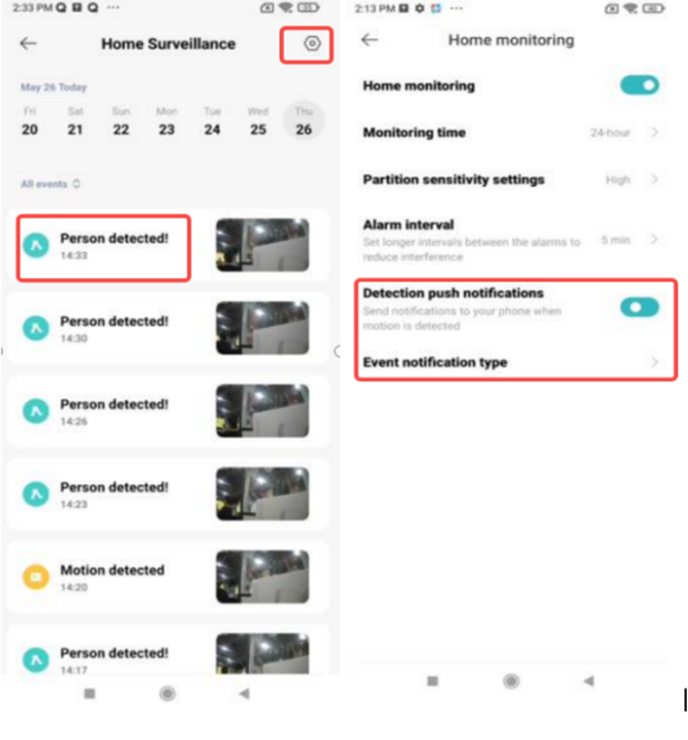 Ev izleme arayüzünün sağ üst köşesindeki Ayarlar'ı tıklayarak >> Ev izleme >> Olay bildirim türü >> Gözetlenen alanda kişi algılandı kısımları seçildiği takdirde bu işlevler kontrol edilebilir.