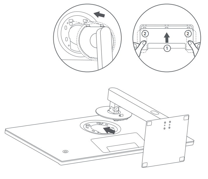 2. Monte edilmiş tabanı ve statifi monitörün arkasındaki yuvaya takın. Standın üst kısmındaki metal plakanın yuvayla düz bir şekilde hizalandığından emin olun, ardından bir "klik" sesi duyana kadar itin. Bu noktada, standın üst kısmı ve monitörün alt kısmı aynı hizada olmalıdır. Düzgün takıldığından emin olmak için standı hafifçe sallayın.