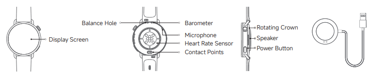 Antrenman, Geçmiş, Koşu, İstatistikler, Antrenman durumu, Kalp atış hızı, Canlılık puanı, SpO2, Uyku, Etkinlikler, Stres, Nefes egzersizleri, Döngüler, Hava Durumu, Kartlar, Takvim, Görevler, Kişiler, Telefon, Kaydedici, Müzik, Ayarlar, Kamera, Alarm, Kronometre, Zamanlayıcı, Dünya saati, Barometre, Pusula, El Feneri, Telefon bul ve daha fazlası.