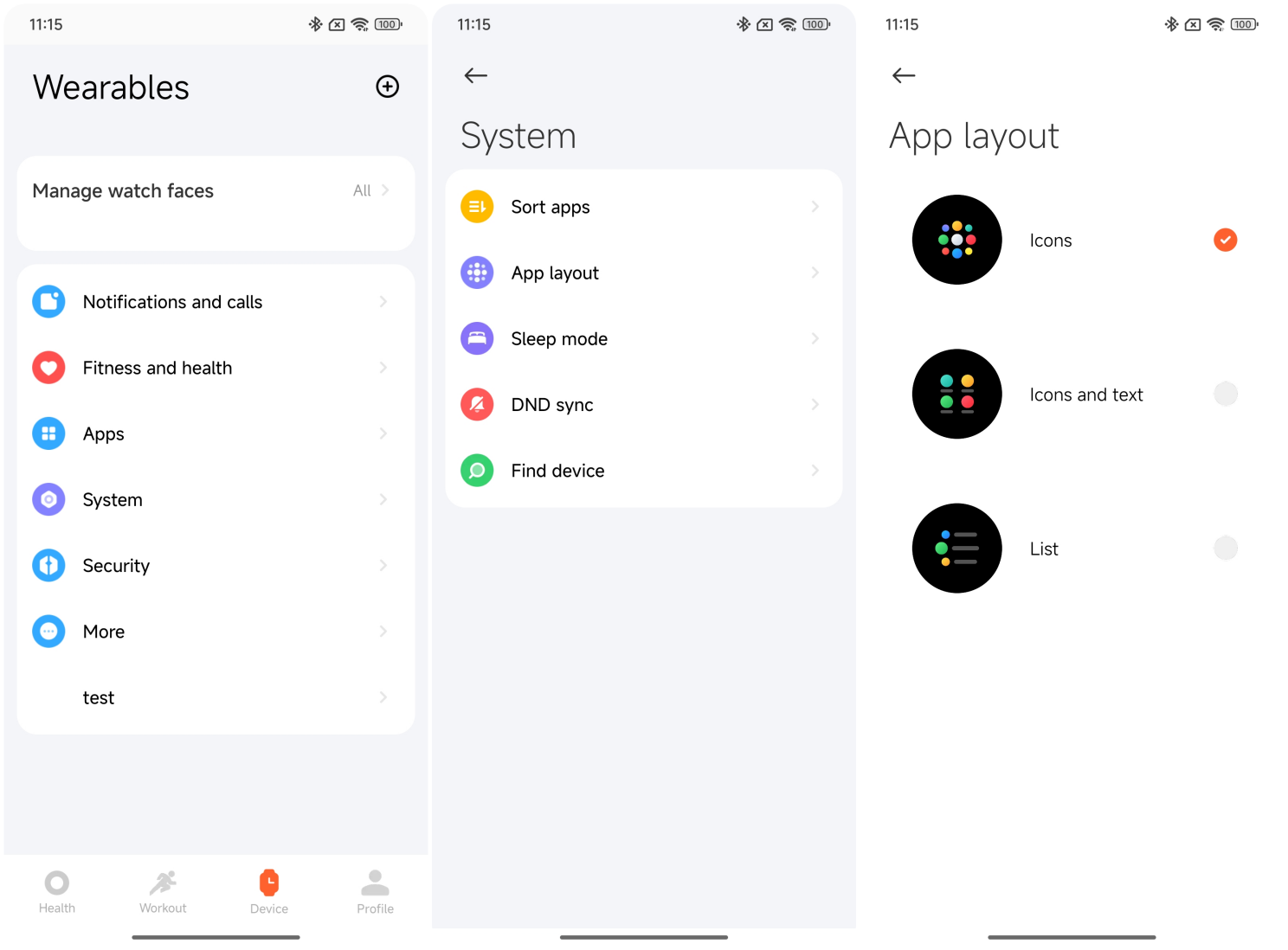 2. Mi Fitness Uygulamasında: Saati bağladıktan sonra [Cihaz] >> girin >> [Sistem]'i seçin >> değişiklikleri yapmak için [Uygulama düzeni]'ne dokunun.