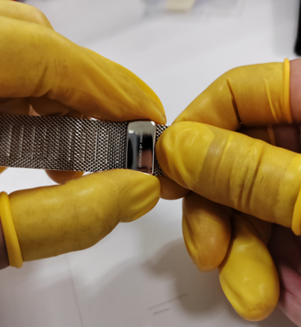 2. Kayışın takılması: Yaylı çubuğun bir ucunu saat kulpu üzerindeki belirlenmiş deliğe sokun. Yay çubuğunun diğer tarafını aşağı doğru bastırın ve karşı çıkıntıya yönlendirin. Yaylı çubuğun güvenli bir şekilde yerine oturduğunu hissedene kadar kayışı yavaşça hareket ettirin.